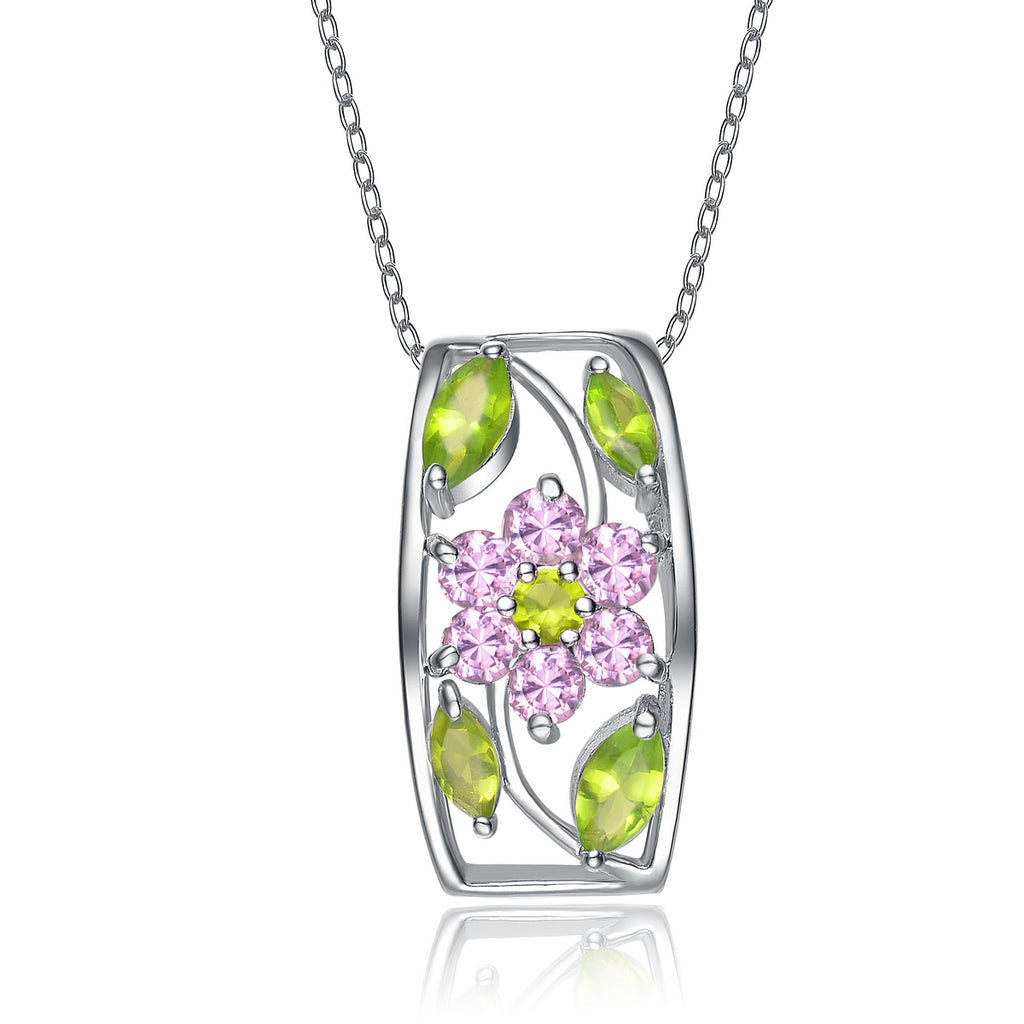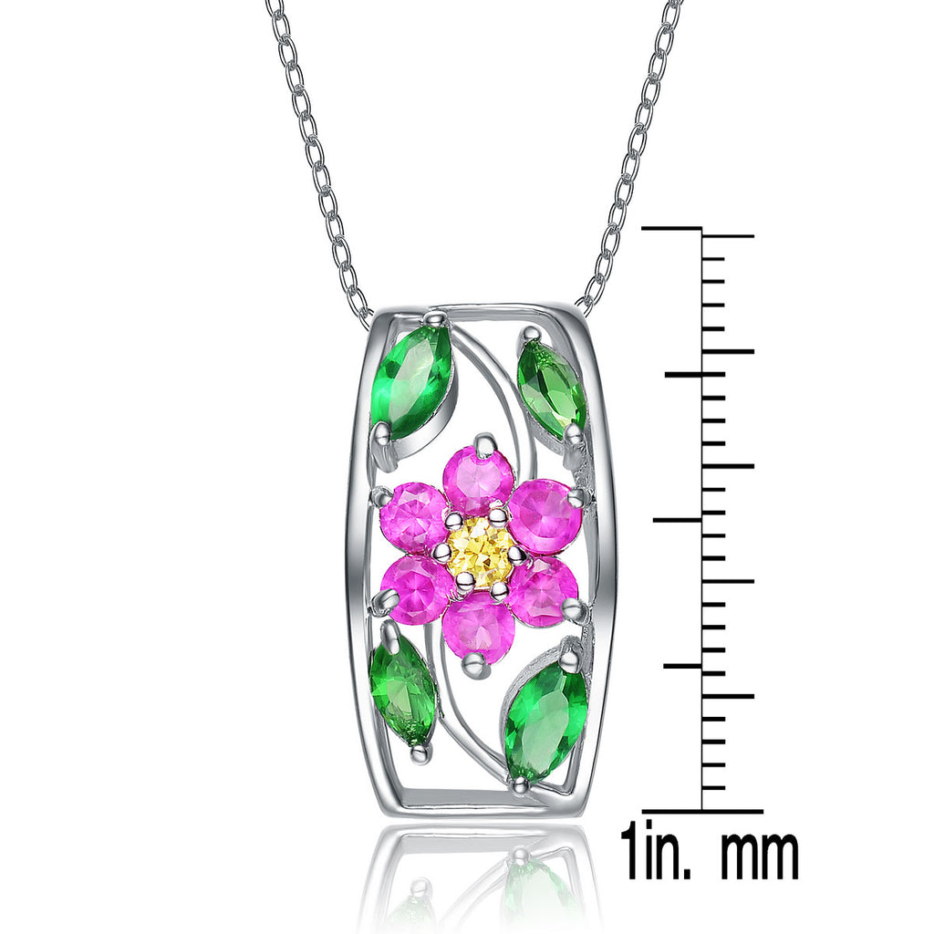 A sterling silver rectangle frame is used to highlight a pink flower made from cubic zirconia stones. This necklace is ideal for nature lovers everywhere.