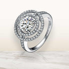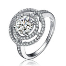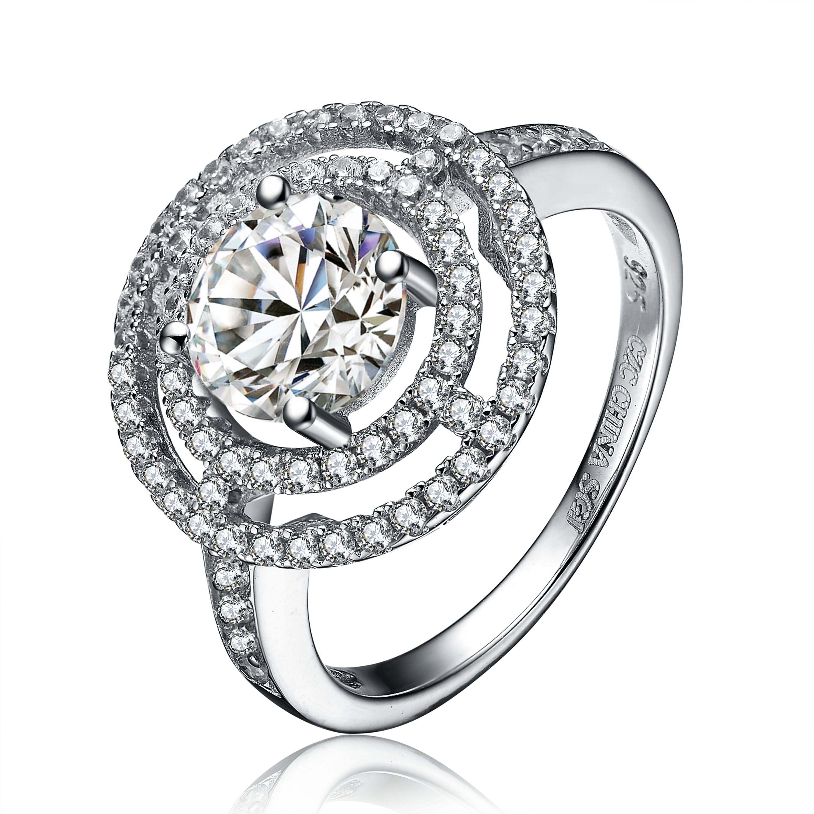 Elegant .925 Sterling silver cubic zirconia halo Modern ring. This stunning ring features large clear round cubic zirconia stone accented by small clear round-cut cubic zirconia stones paved on circle frames, as well as on the band. Crafted of .925 Sterling silver in rhodium plating and it is available in 6, 7, 8 size.