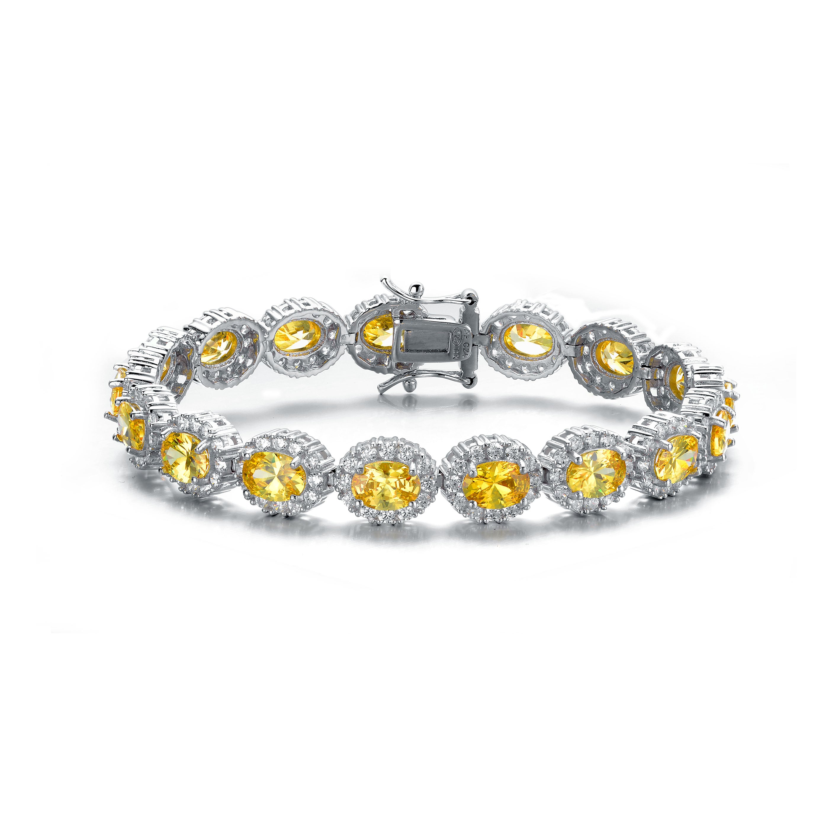 This stylish .925 sterling silver link bracelet showcases bold oval stones available in Yellow, White, Emerald, and Sapphire variations. Each oversized center stone is framed in a matching oval metal setting and highlighted with sparkling clear round cubic zirconia accents. Crafted in sterling silver and secured with a classic box clasp, this piece makes a beautiful gift.