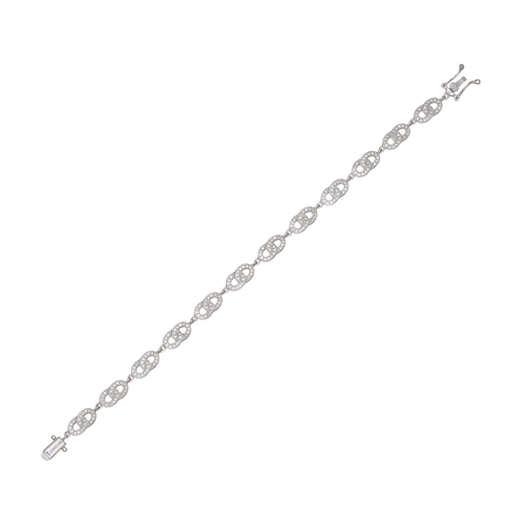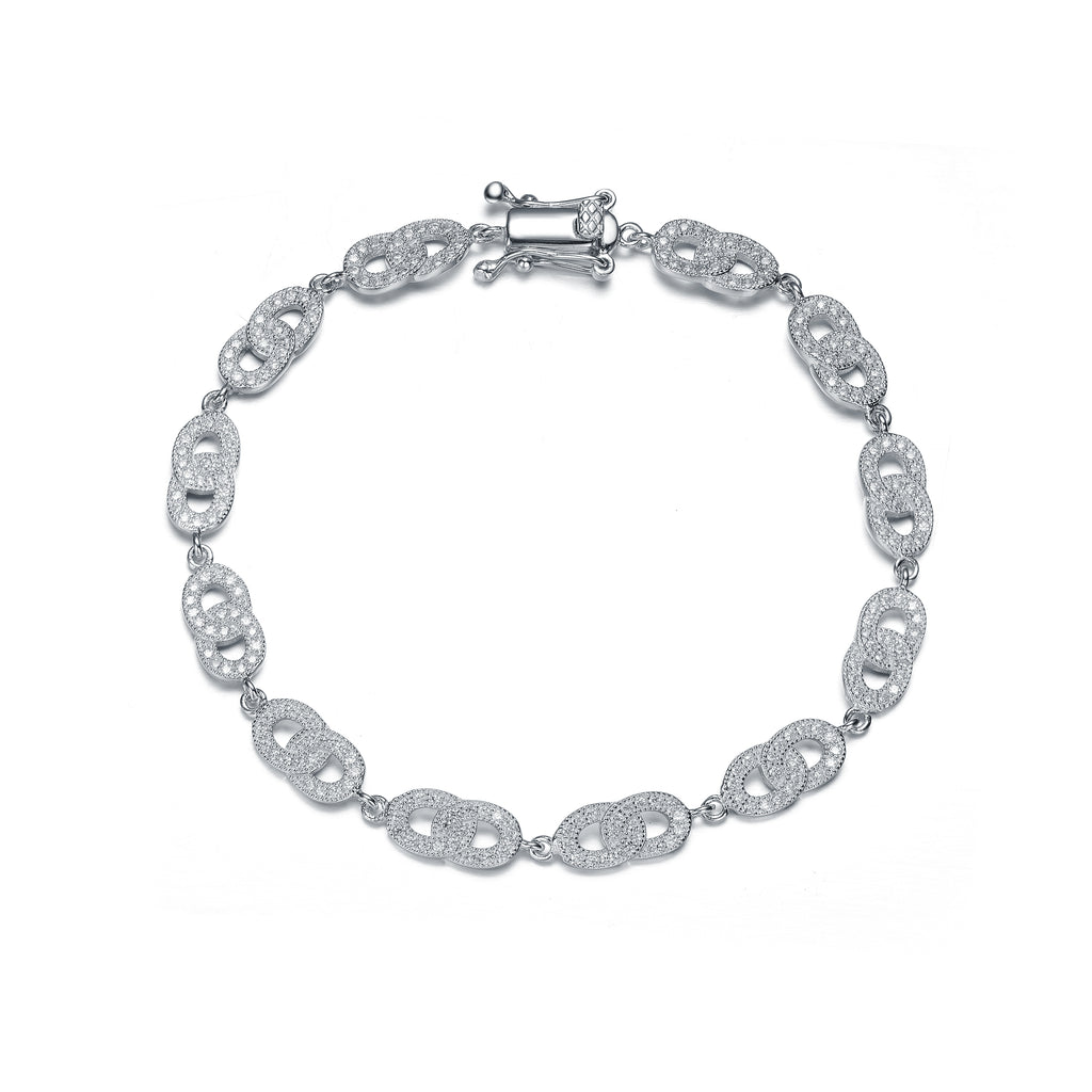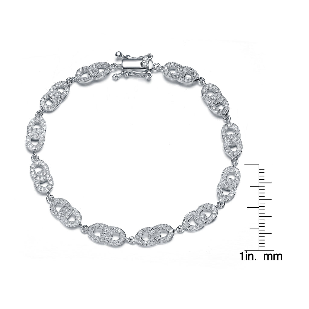Smoothly conjoined pairs of blended links glimmer in sterling silver and bask in implanted tiny cubic zirconia, a glorious finish for this dainty bracelet.