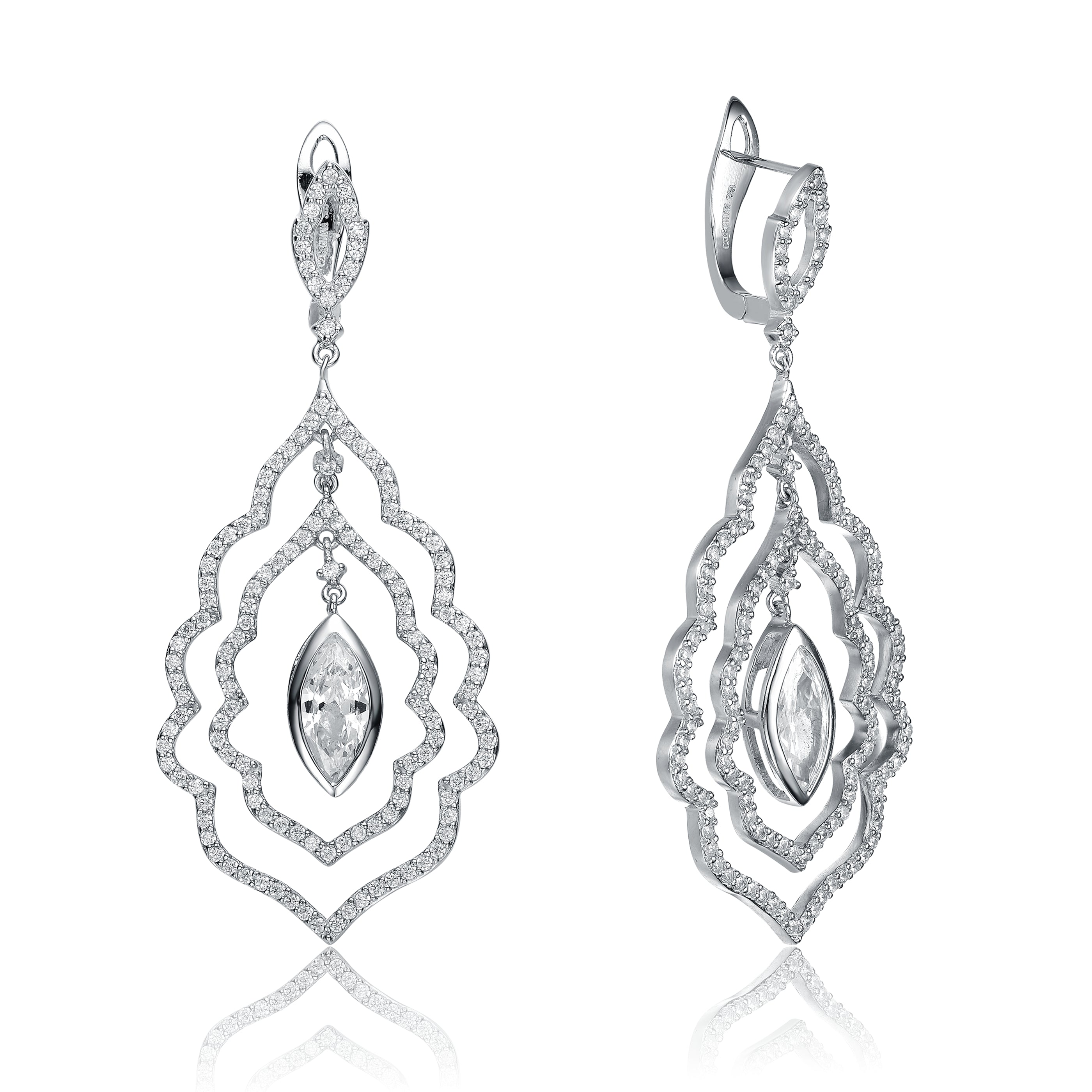 A suspended clear cubic zirconia stone is the focus of this set of earrings. It also uses a delicate pattern crafted out of sterling silver.