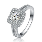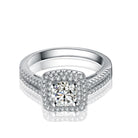 This breathtaking .925 Sterling silver ring involves a beautiful brilliant cut cubic zirconia solitaire surrounded by a double halo of cubic zirconia stones and additional cubic zirconia along the band, this ring is available in size 6,7,8.