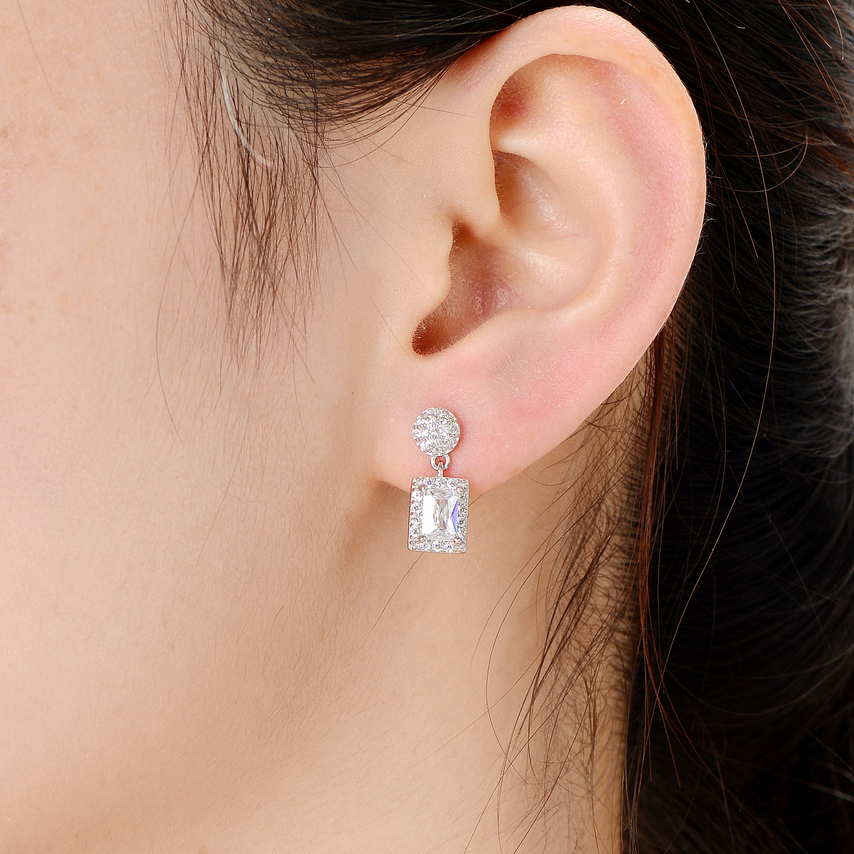 These hypnotic earrings feature emerald cut cubic zirconia solitaires. Wear them during the evening and they will be sure to shine bright in any light.