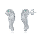 Sterling Silver with Emerald & Cubic Zirconia Walking Panther Earrings. Harness the undeniable elegance and courage of the panther reimagined into a glamorous design for you to enjoy. These adorable sterling silver white gold plated earrings feature emerald-like cubic zirconias (May Birthstone) eyes complemented by glittering round brilliant cut -like cubic zirconias pave set on each slinky walking panther. Butterfly backs keep these earrings secure, allowing them to drop slightly past the earlobes when worn.