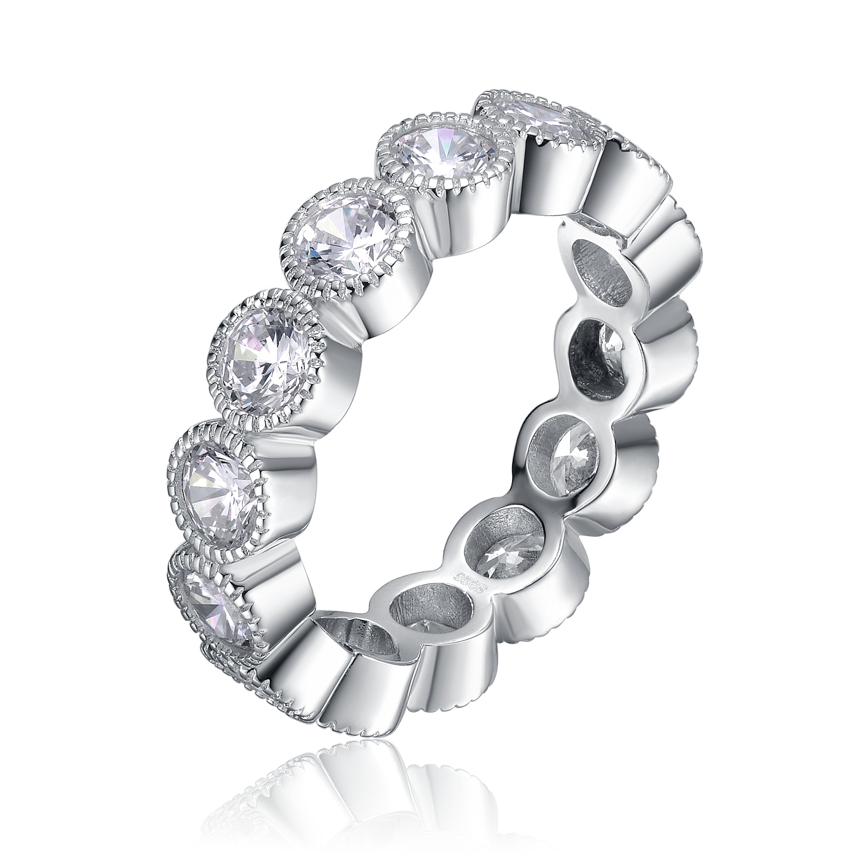 This sterling silver eternity ring features a continuous loop of large round-cut cubic zirconia stones. Each stone is meticulously set in a secure bezel setting, enhancing the brilliance and ensuring durability. The high polish finish on the sterling silver complements the sparkle of the cubic zirconias, making this ring an choice for those seeking a luxurious yet affordable alternative to diamonds. Whether worn as a symbol of eternal love or simply as a stunning accessory, this cubic zirconia eternity band adds timeless elegance to any hand