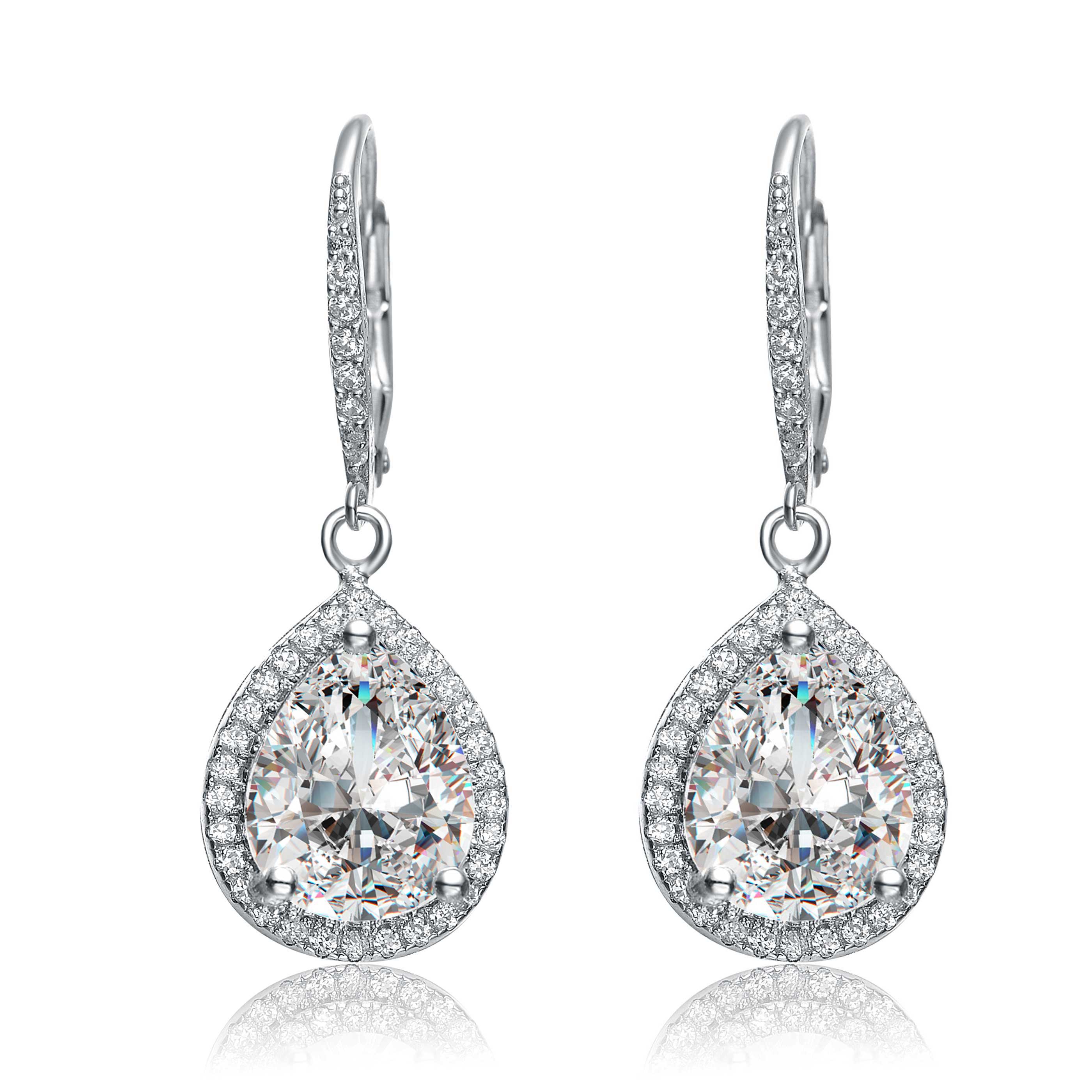Sterling Silver White Gold Plated Cubic Zirconia Accented stones. Step out in style wearing these earrings. These earrings are adored with sparkling Cubic Zirconia round stones. These beautiful earrings are secured with lever backs. The delicate design makes this earring dainty and elegant.