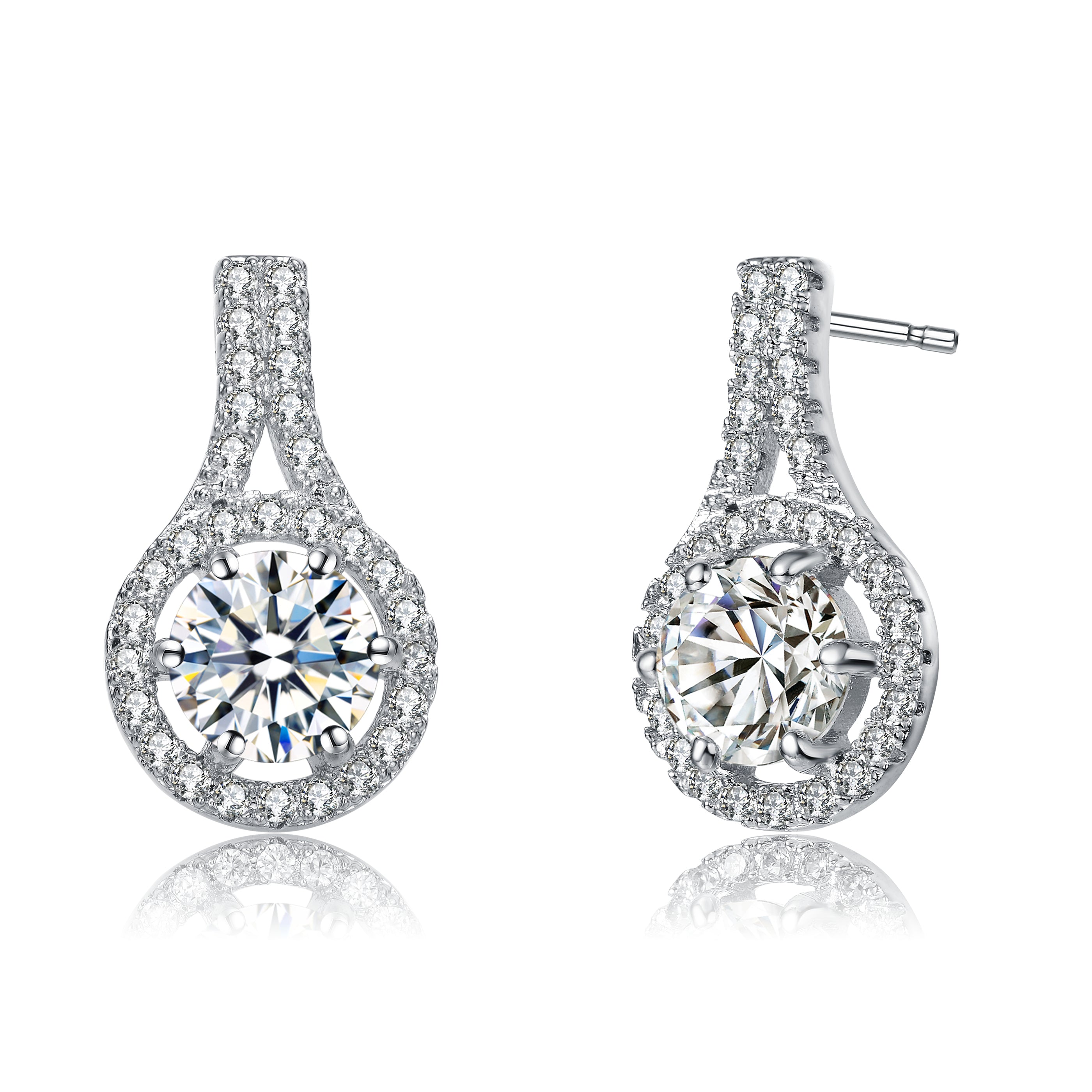 These dainty stud earrings are decorated with large and small clear round-cut cubic zirconia stones set on the metal frame. Crafted of .925 sterling silver, and are available with rhodium plating. These fantastic earrings secure with butterfly closure.