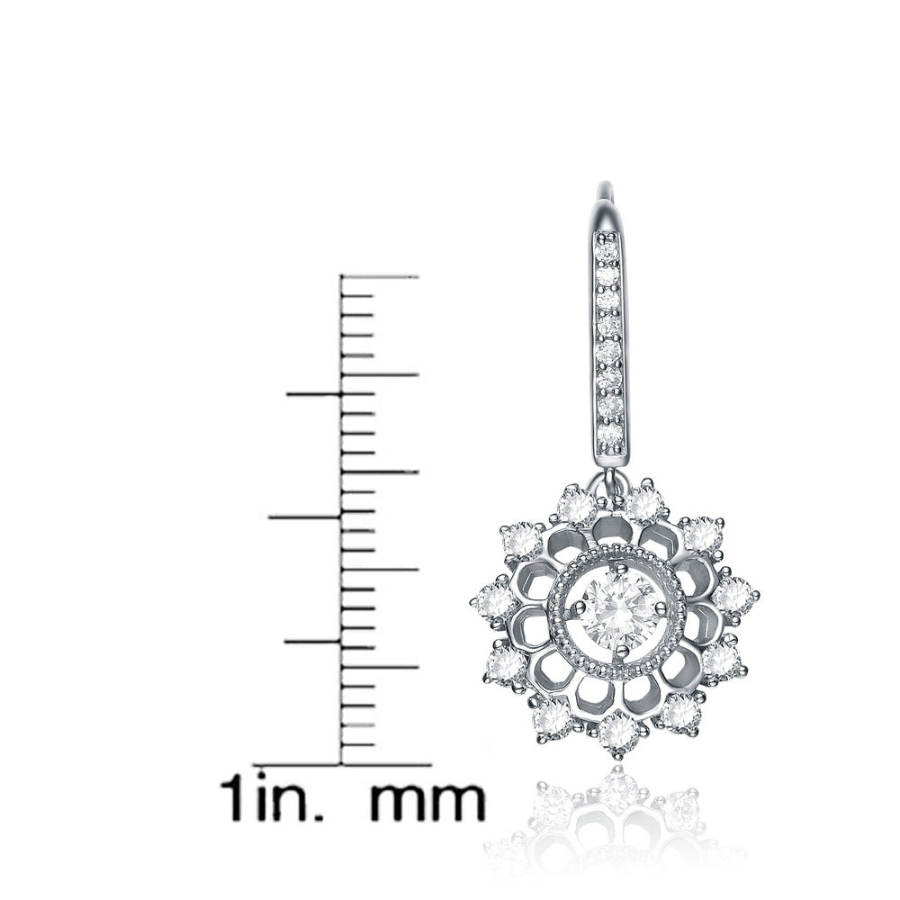 These exquisite sterling silver drop earrings feature a radiant rhodium-plated finish that enhances their durability and shine. Designed with an intricate floral-inspired pattern, each earring is adorned with sparkling cubic zirconia stones, creating a dazzling halo effect. The centerpiece stone is encircled by delicate accents, while the drop design ensures graceful movement and elegance.