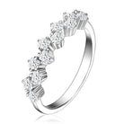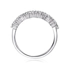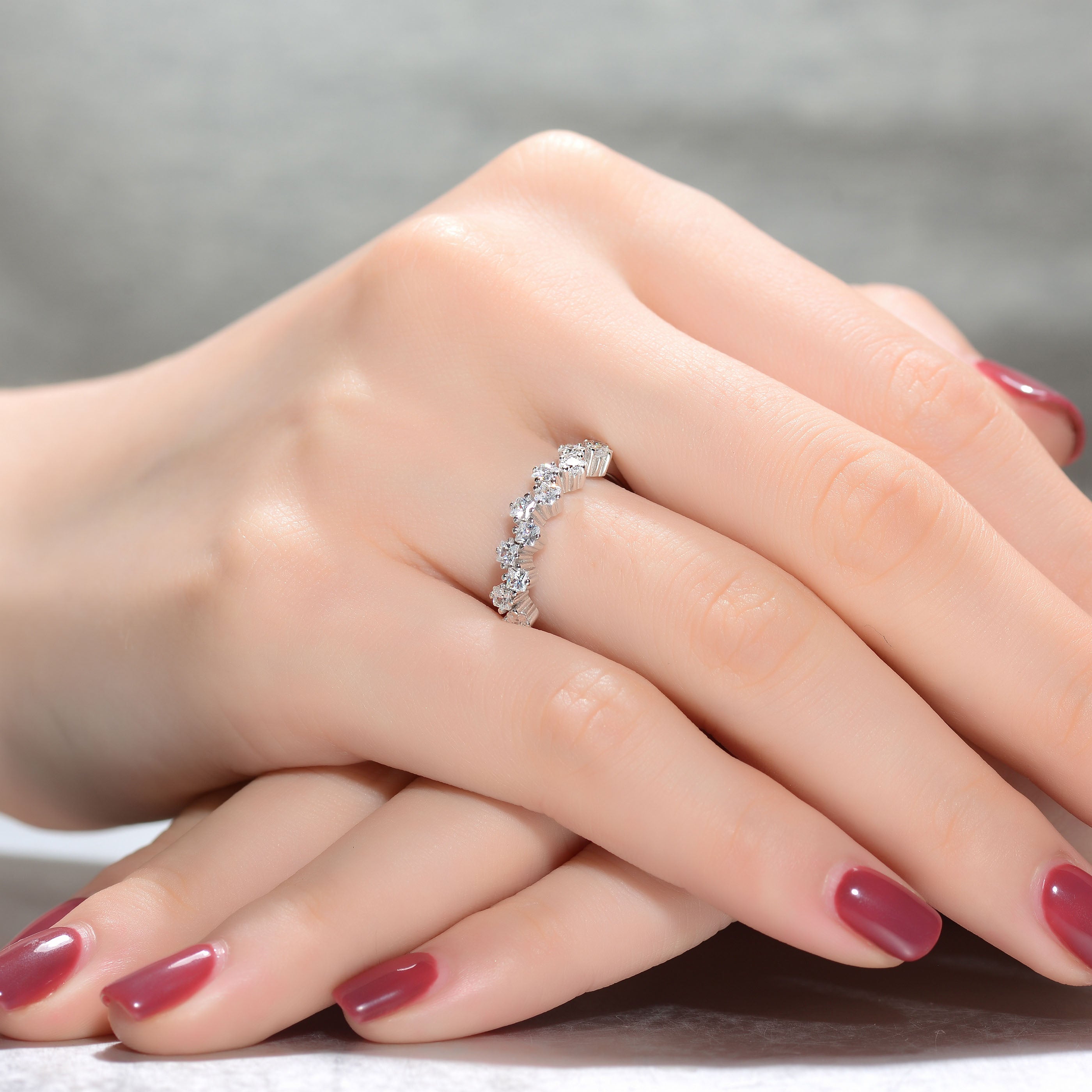 This stunning ring is meticulously crafted from sterling silver and plated with rhodium for enhanced shine and durability. The ring features a continuous row of sparkling cubic zirconia stones, each securely set in a prong setting. The brilliance of the cubic zirconia mimics the appearance of diamonds, making this ring an affordable yet luxurious choice. Its sleek design and polished finish highlight the precision craftsmanship, making it a captivating piece of jewelry suitable for special occasions or everyday wear. Whether worn alone or stacked with other rings, this eternity band exudes sophistication and timeless beauty.