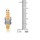 These glittering earrings are criss-crossed at the center with sterling silver victorian detail engraving. These criss-crosses are wrapped in a graceful hug around silver centered and gold sided hoops. Cubic zirconia impresses throughout. A practical omega styled closure is fitted at the back.