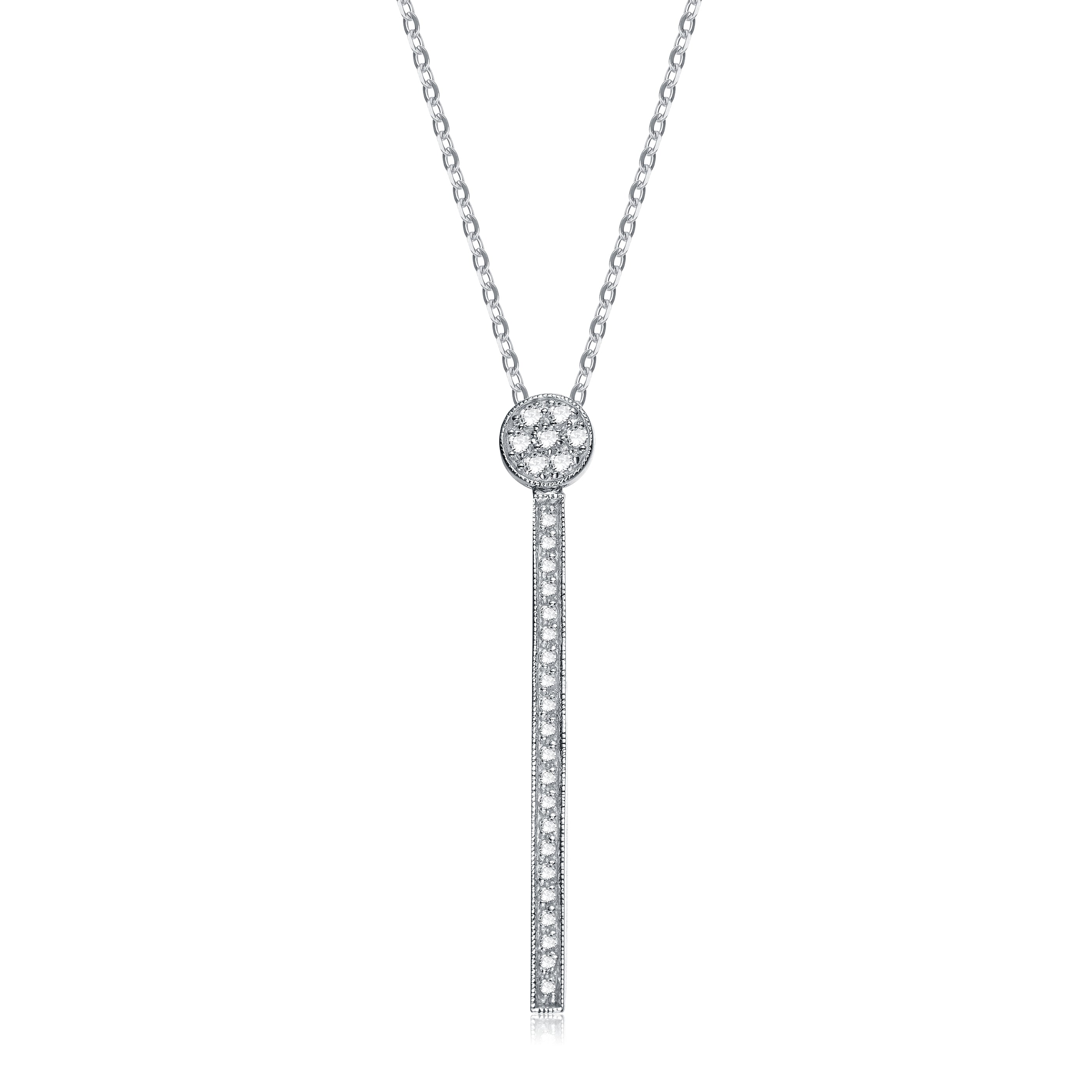 A delicate thin line of white cubic zirconia rests within a sterling silver frame. This pendant, adds a touch of understated elegance and works great for any everyday outfit and is very affordable.