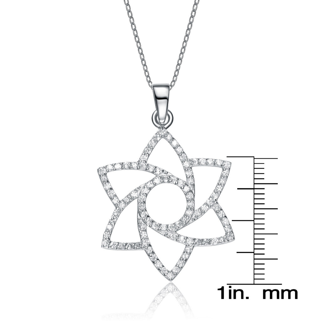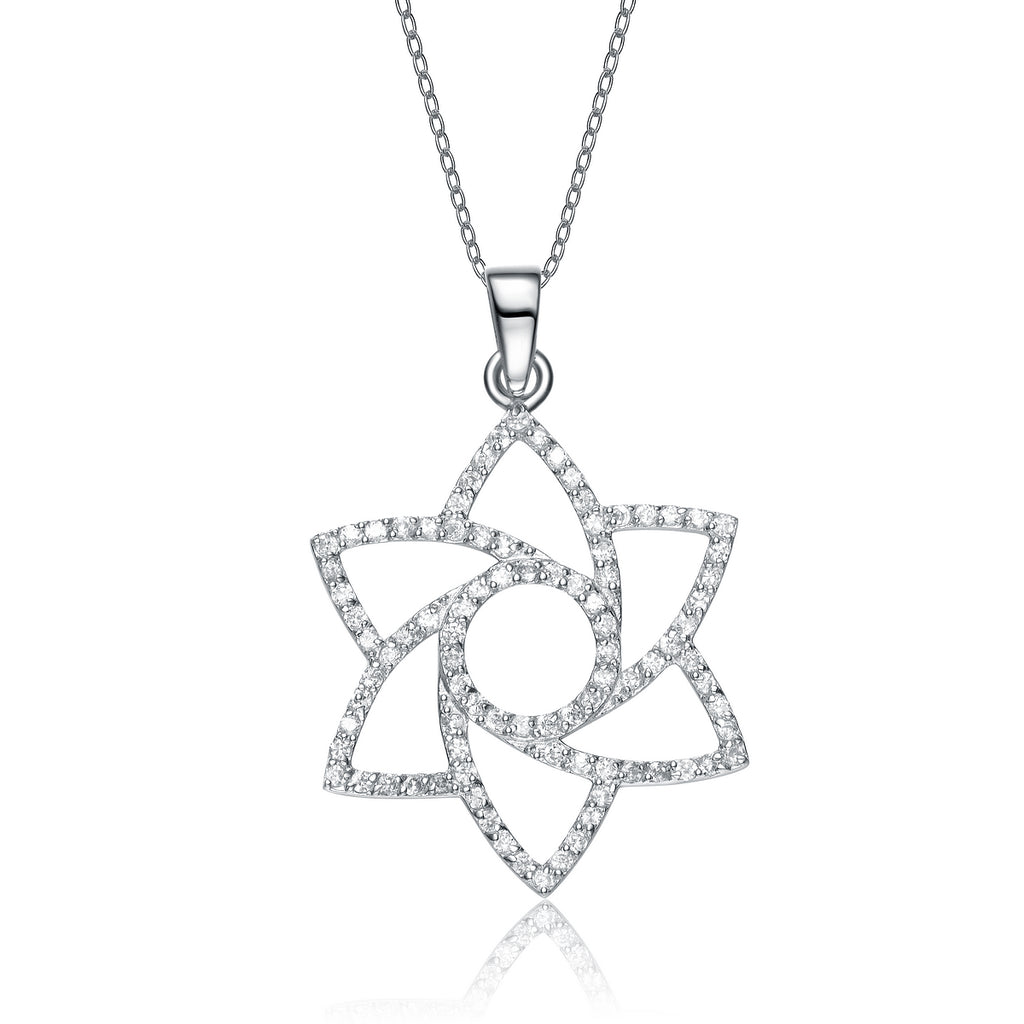 This unusual floral shaped pendant is made of many white cubic zirconia to form a sharp floral outline. Laid in sterling silver, this simple design works well in accentuating the owner’s feminity and adds class to any dress.