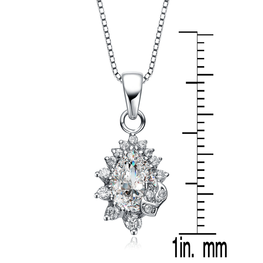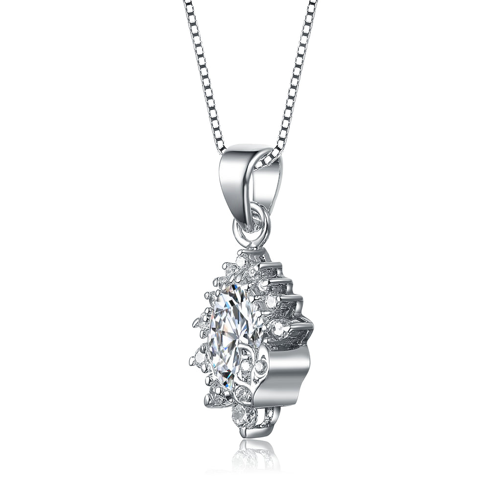 This is a studded stunning sterling silver pendant that has a lot of design styles going on. First of all, the center of this beautiful chaotic design is a large white cubic zirconia stone; the edges are made of small pieces of sterling silver that looks like petals bedazzled with small zirconium stones.