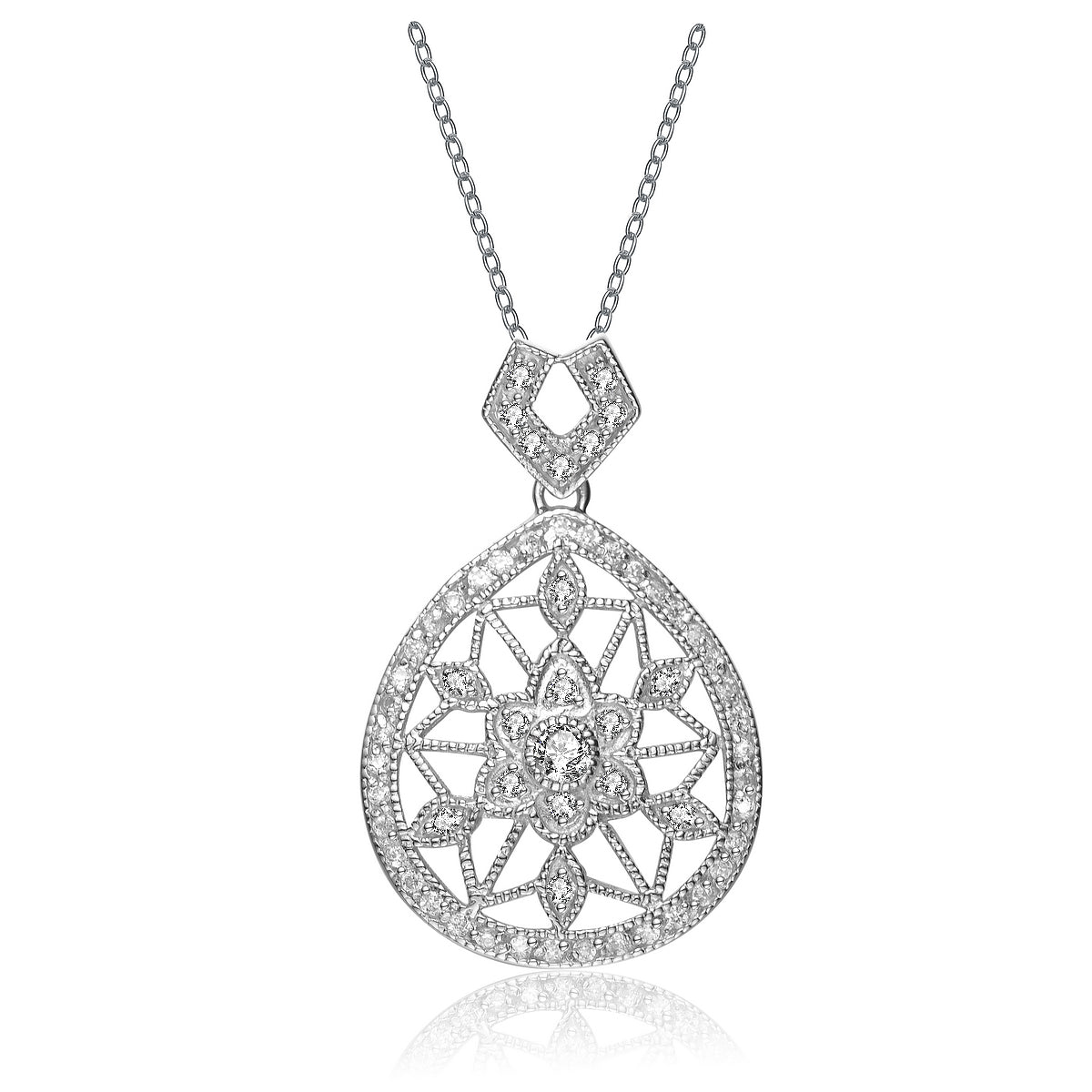 Elevate your style with our Sterling Silver White Gold-Plated Antique Lace Drop Pendant, featuring a Round Cubic Zirconia. A timeless masterpiece that radiates sophistication and adds a touch of elegance to your look. Discover vintage charm today.