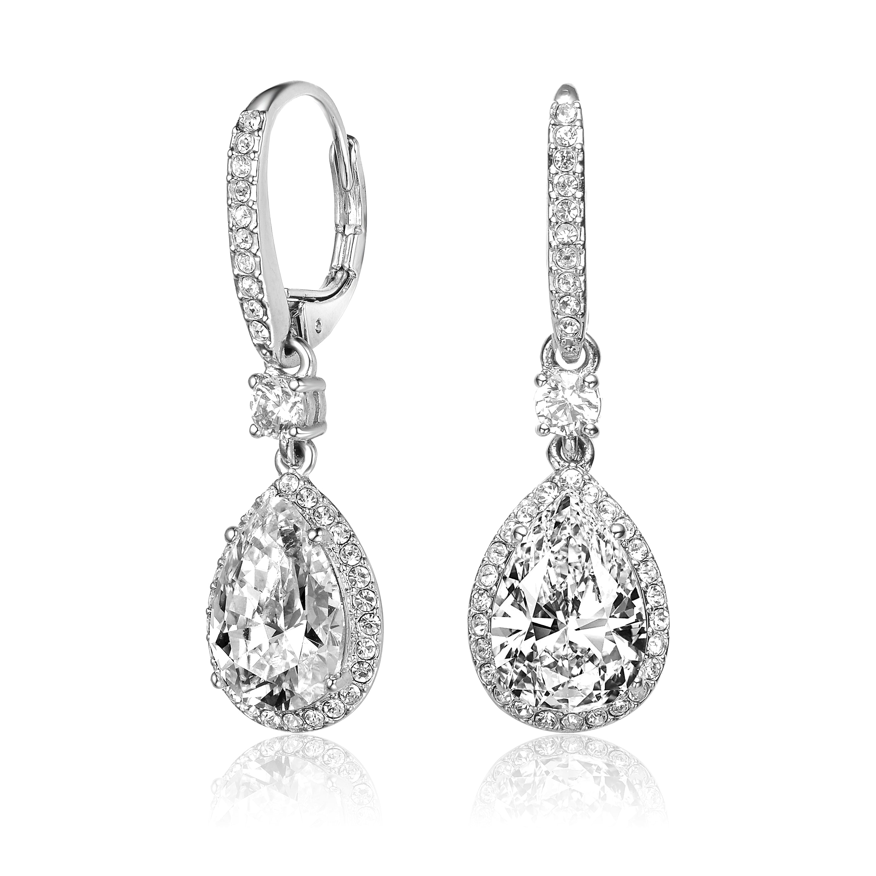 Elegance meets simplicity in this stunning pair of drop earrings, showcasing teardrop-shaped clear cubic zirconia that shimmers with timeless charm. The stones are set in sterling silver, plated with radiant white gold to enhance their brilliance and durability. With each movement, the faceted pear-cut stones reflect light effortlessly, making them perfect for both daywear sophistication and evening sparkle. A secure lever-back closure completes the design, offering comfort without compromising on style.