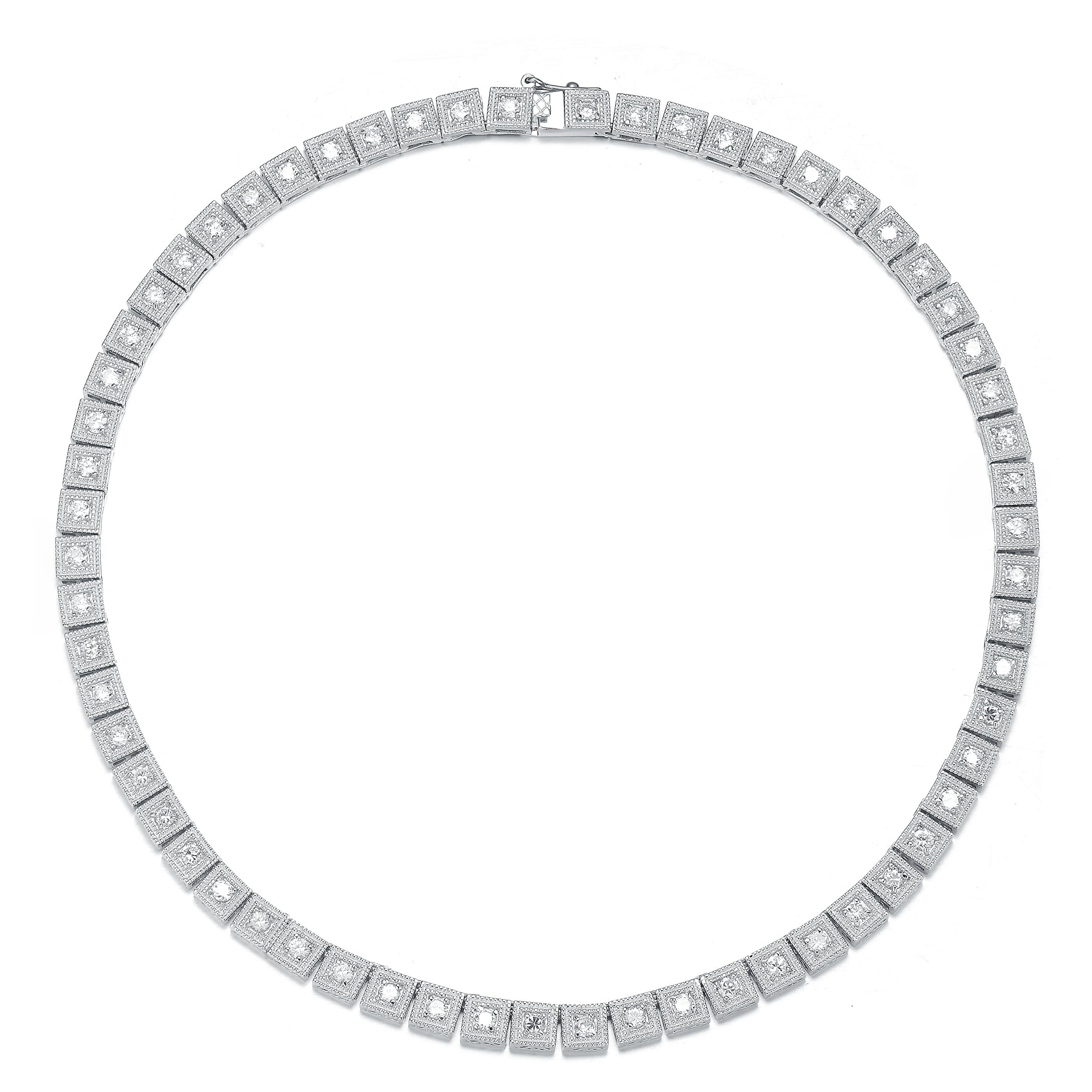 Sterling Silver with Cubic Zirconia Graduated Geometric Link Tennis Necklace. Glittering round brilliant cut -like cubic zirconias adorn this statement-worthy necklace, nestled in geometric links reminiscent of an Art Deco style. These symmetrical links create a semi-flexible chain, allowing this ornate necklace to sit gracefully along the collarbone when worn, complementing any collar type. A hidden box clasp and figure eight safety keep this glam necklace secure, all in a rich, durable white gold plated sterling silver finish.