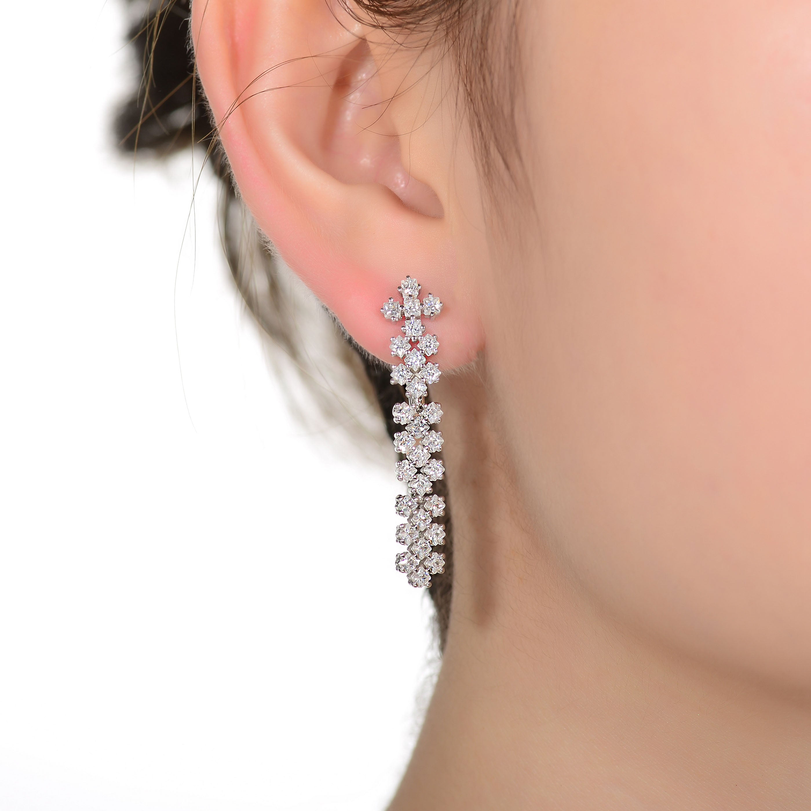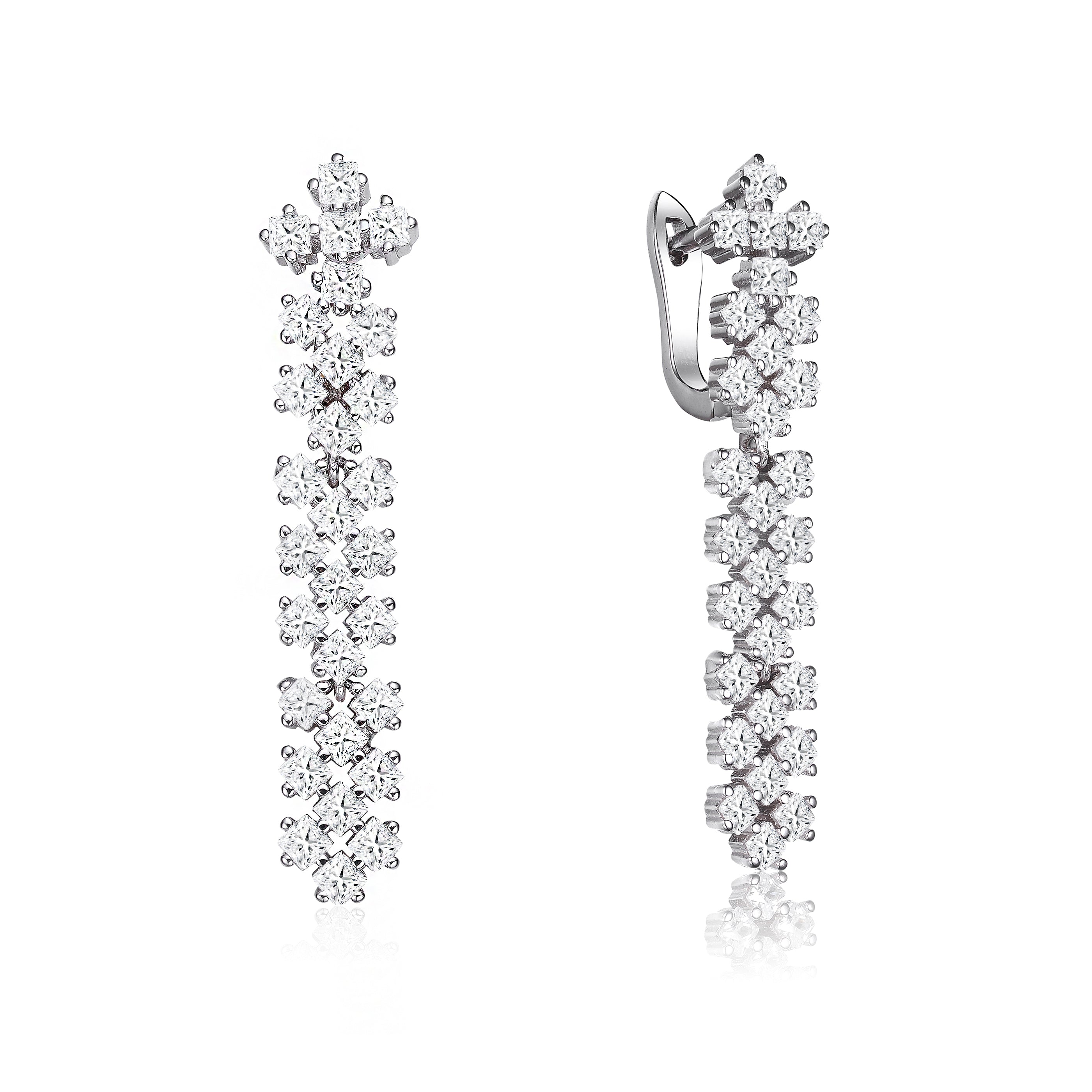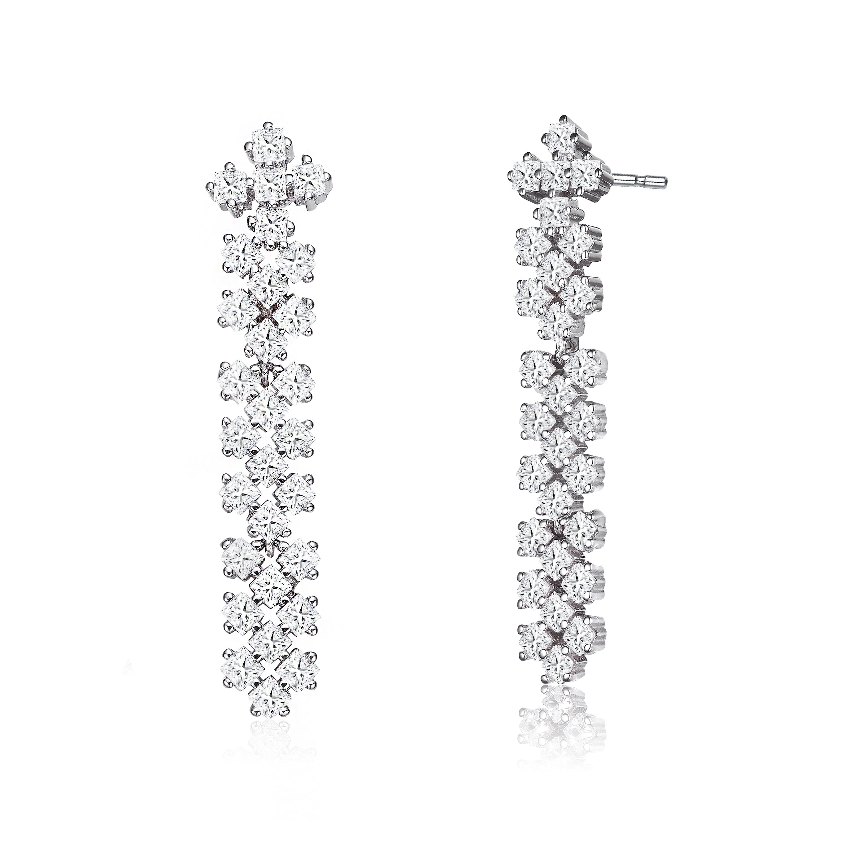 Designed to impress, these lattice-style dangle earrings feature princess-cut cubic zirconia arranged in an architectural grid that sparkles with modern elegance. The clean lines and polished rhodium finish enhance the brilliance of each stone, while the elongated drop creates a flattering, refined profile. Perfect for upscale occasions, these earrings deliver statement-making sophistication with timeless appeal.