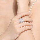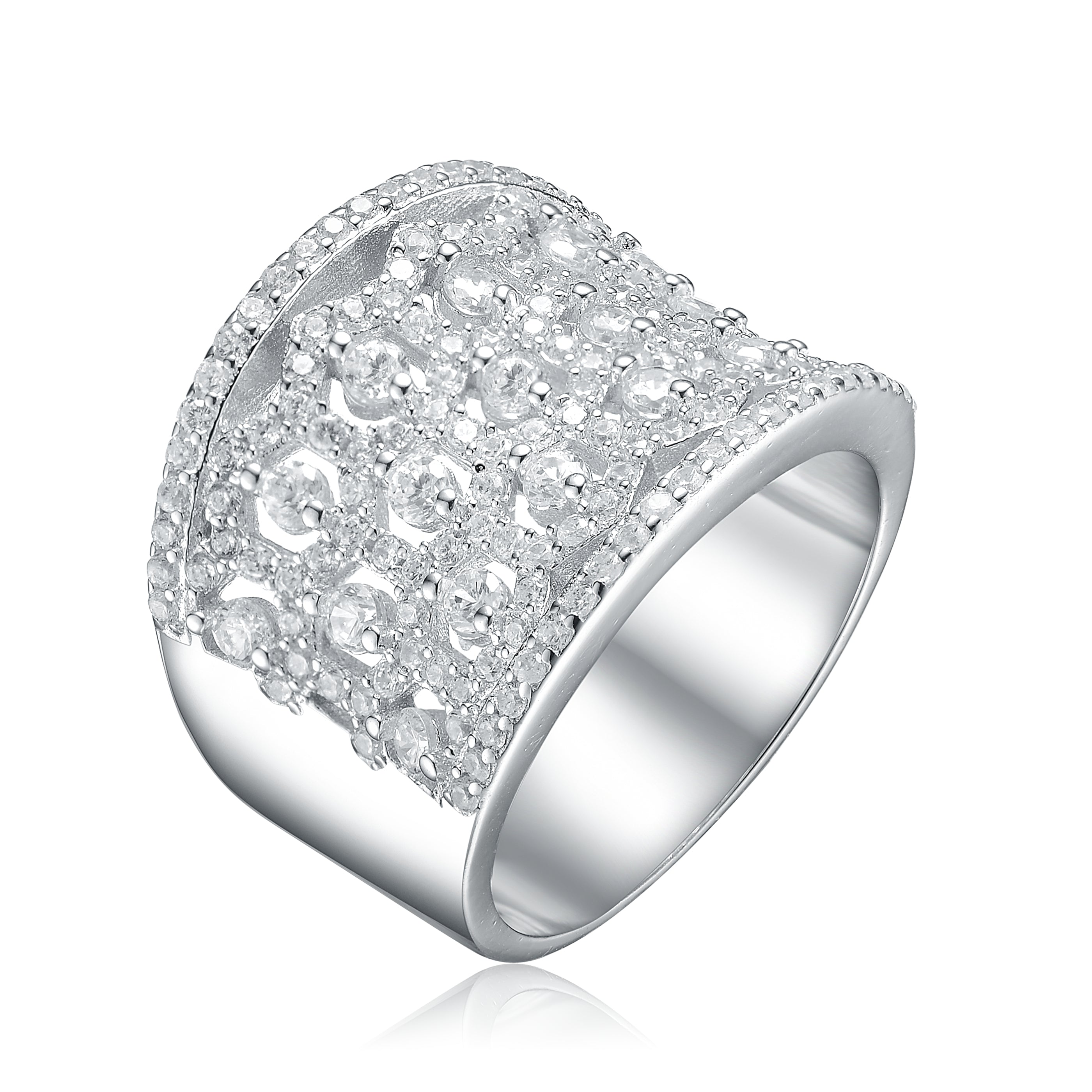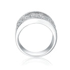 This gorgeous three row cocktail ring could make a splendid gift for your partner. It is made from Sterling silver with Rhodium plated that highlights the rows of clear round Cubic Zirconia. Several open shapes are used to separate each rows and accentuate the wide ring band. Add glamour to your fashion every time you wear this ring. This ring is a size 7.