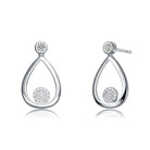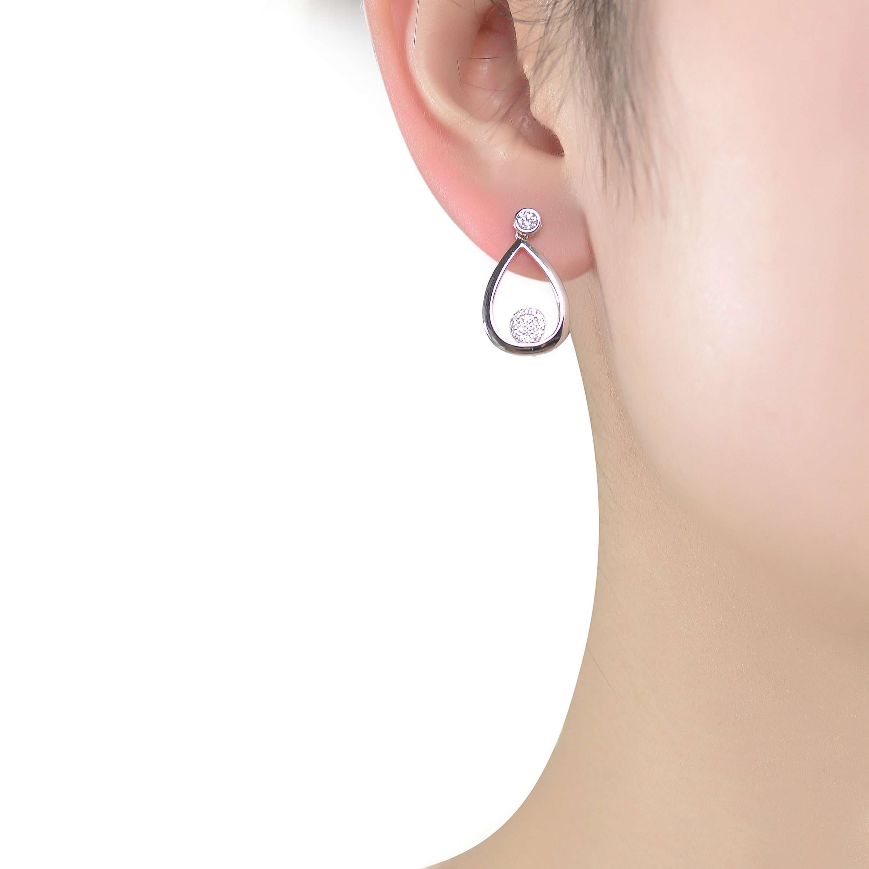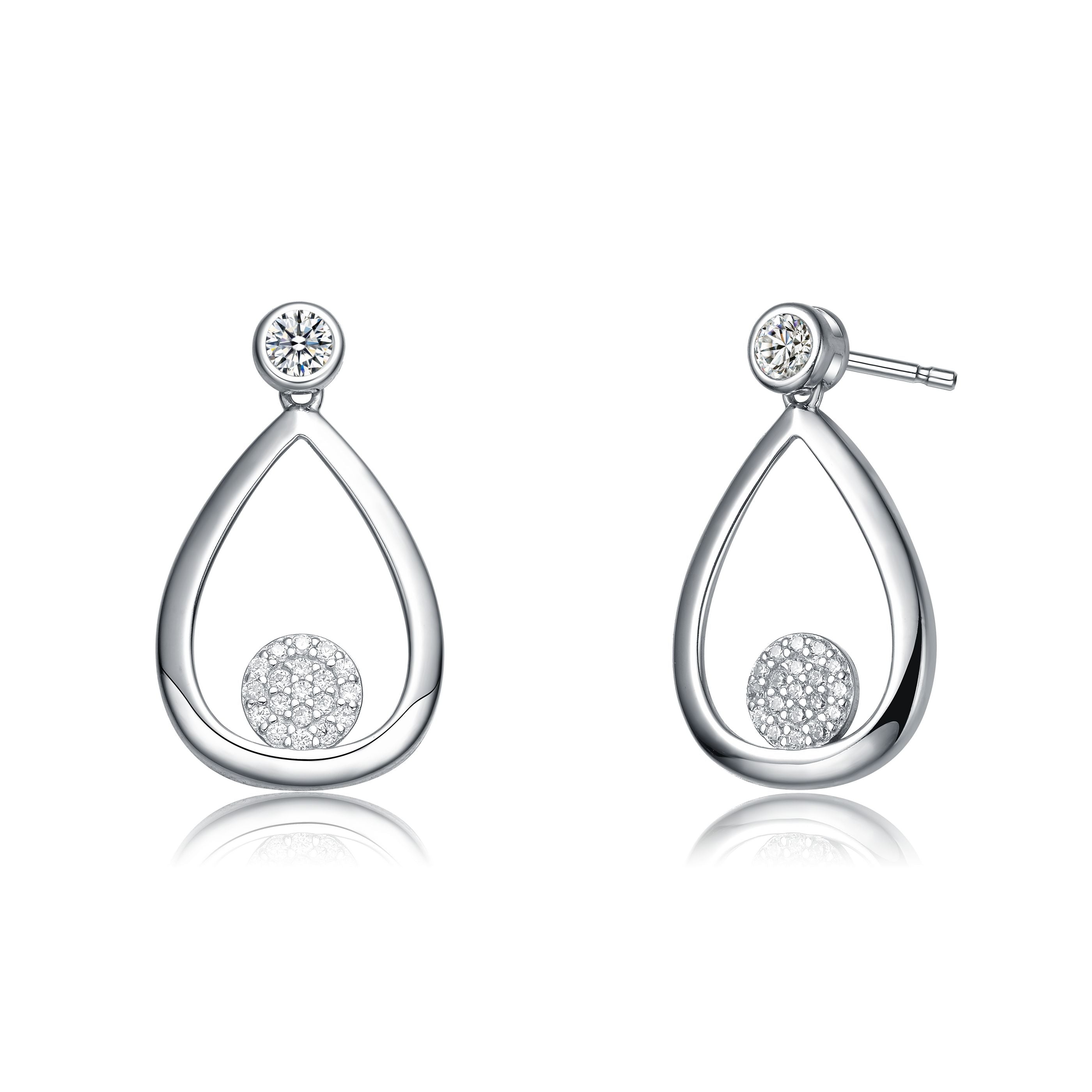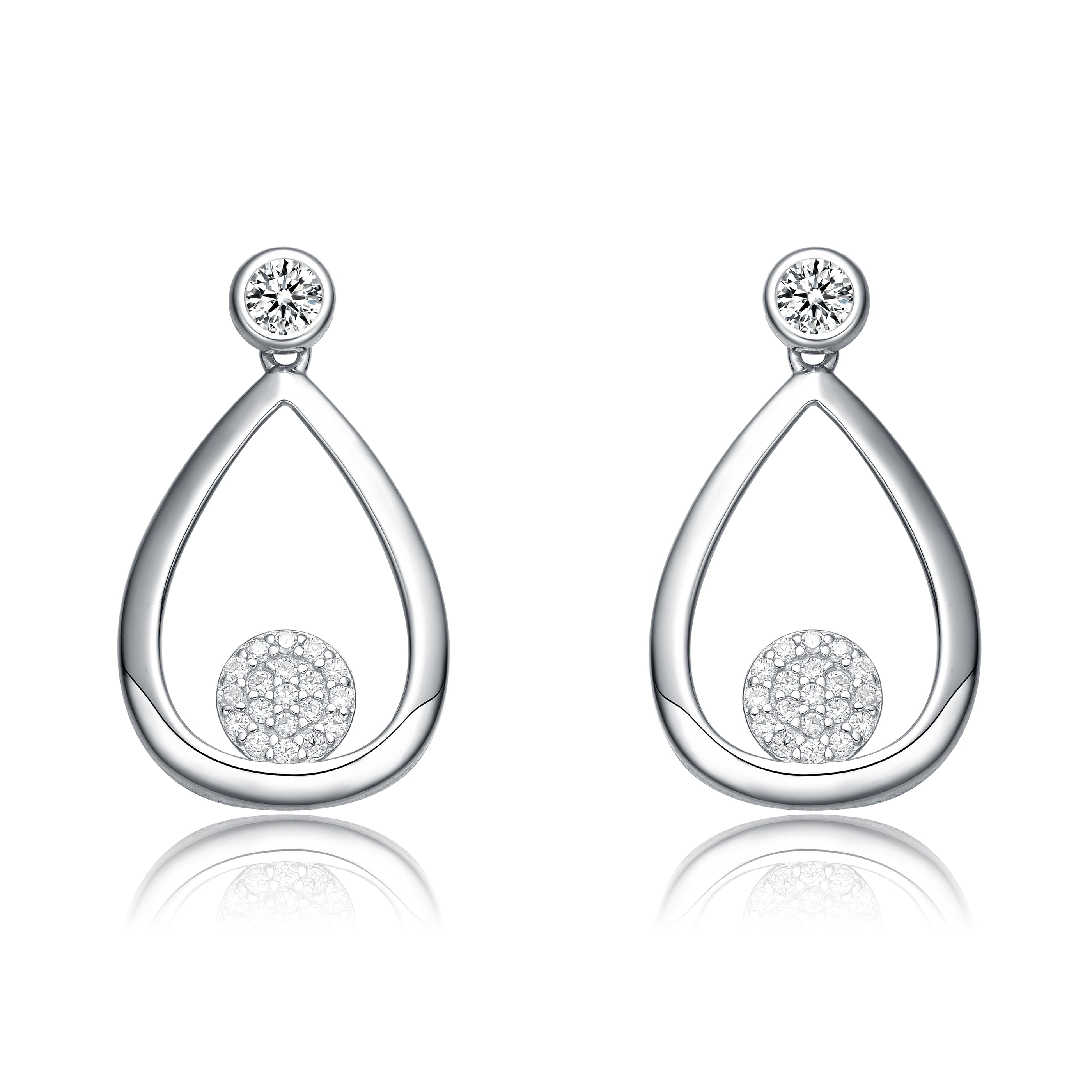 Show off your glam with these earrings. The fabulous shape features pear shape- a pear shaped silver base, with round silver shapes paved with clear round Cubic Zirconia stones, one is within the pear frame and the other is on the top of the pear frame continuing to the post on the back part. These Sterling Silver earrings secure with a butterfly closure.