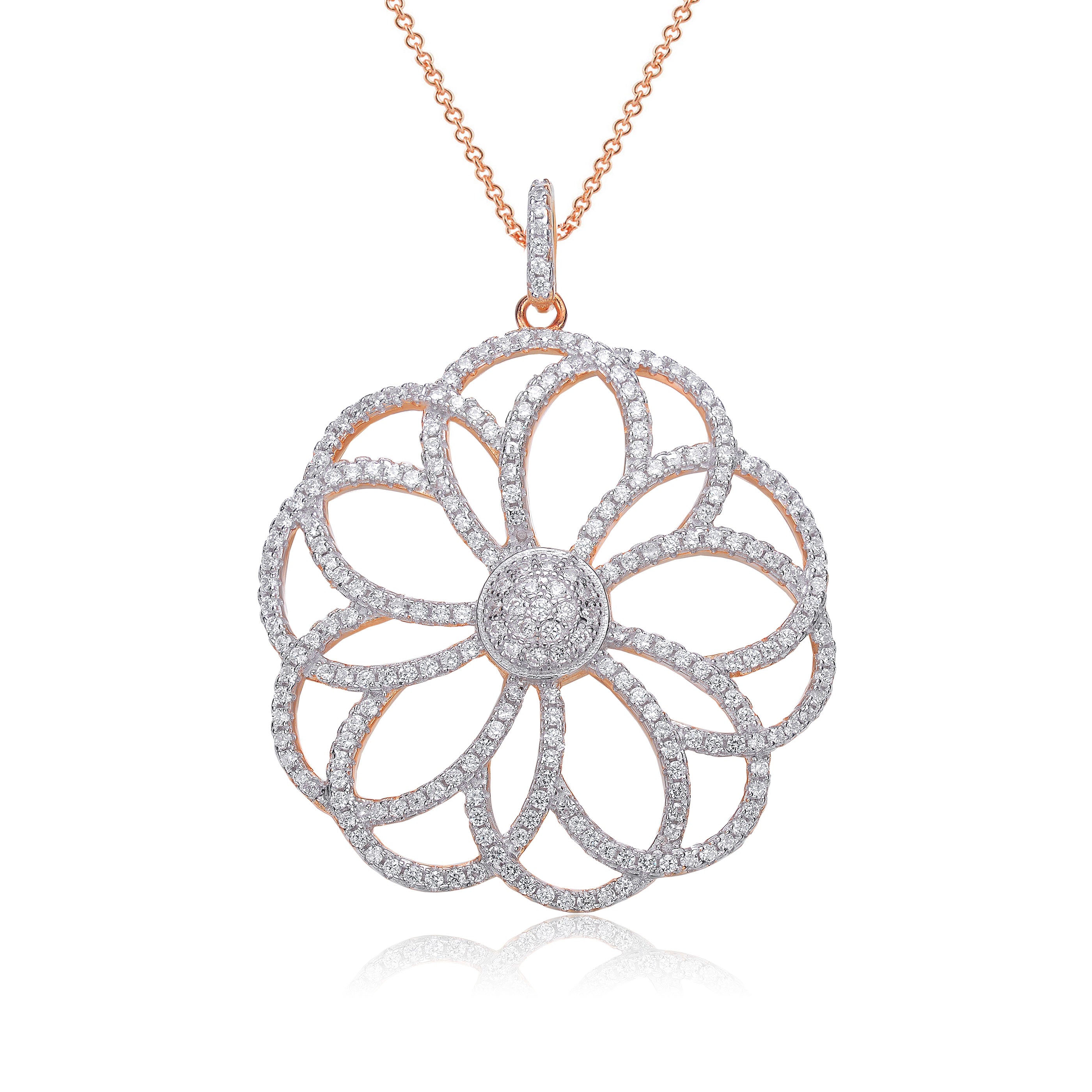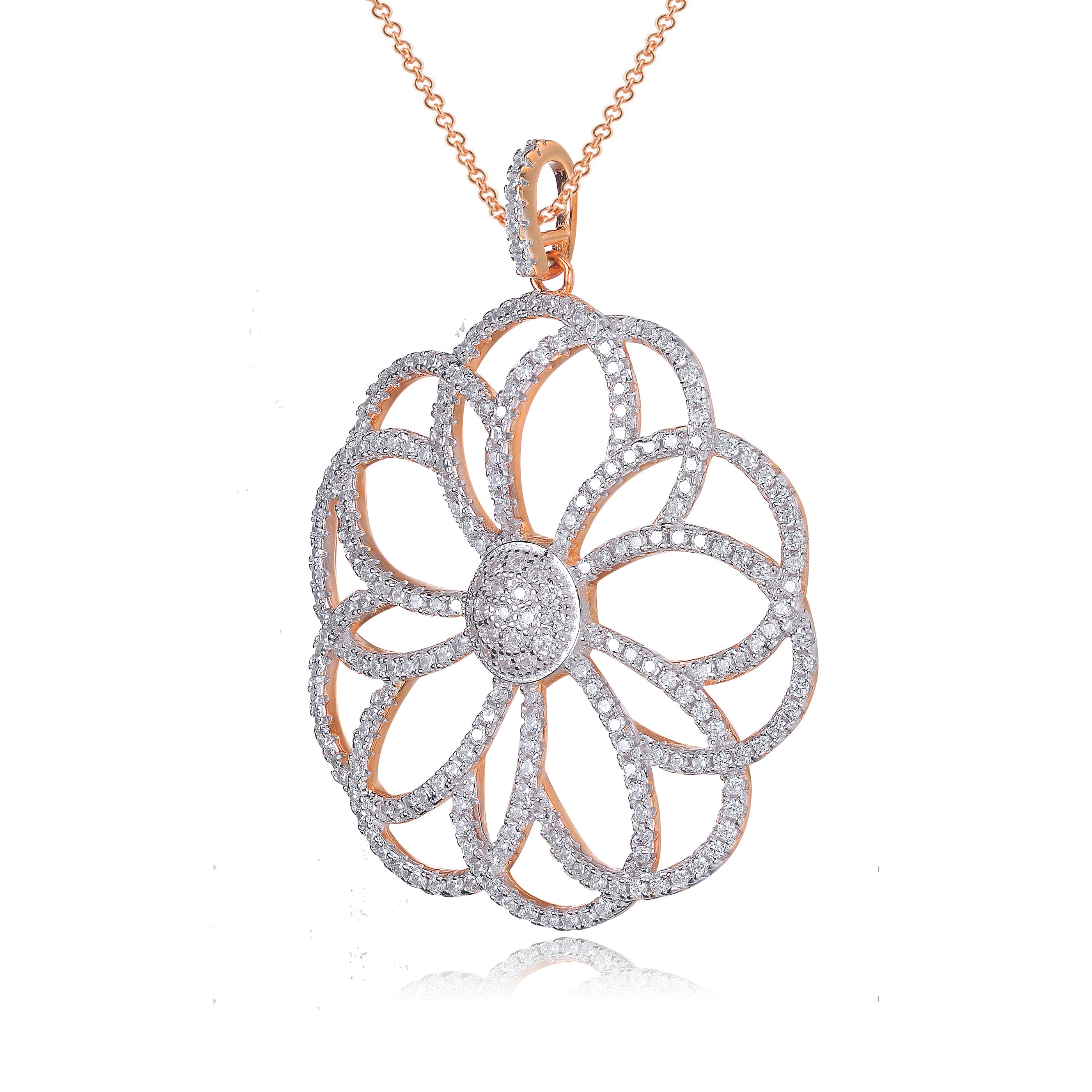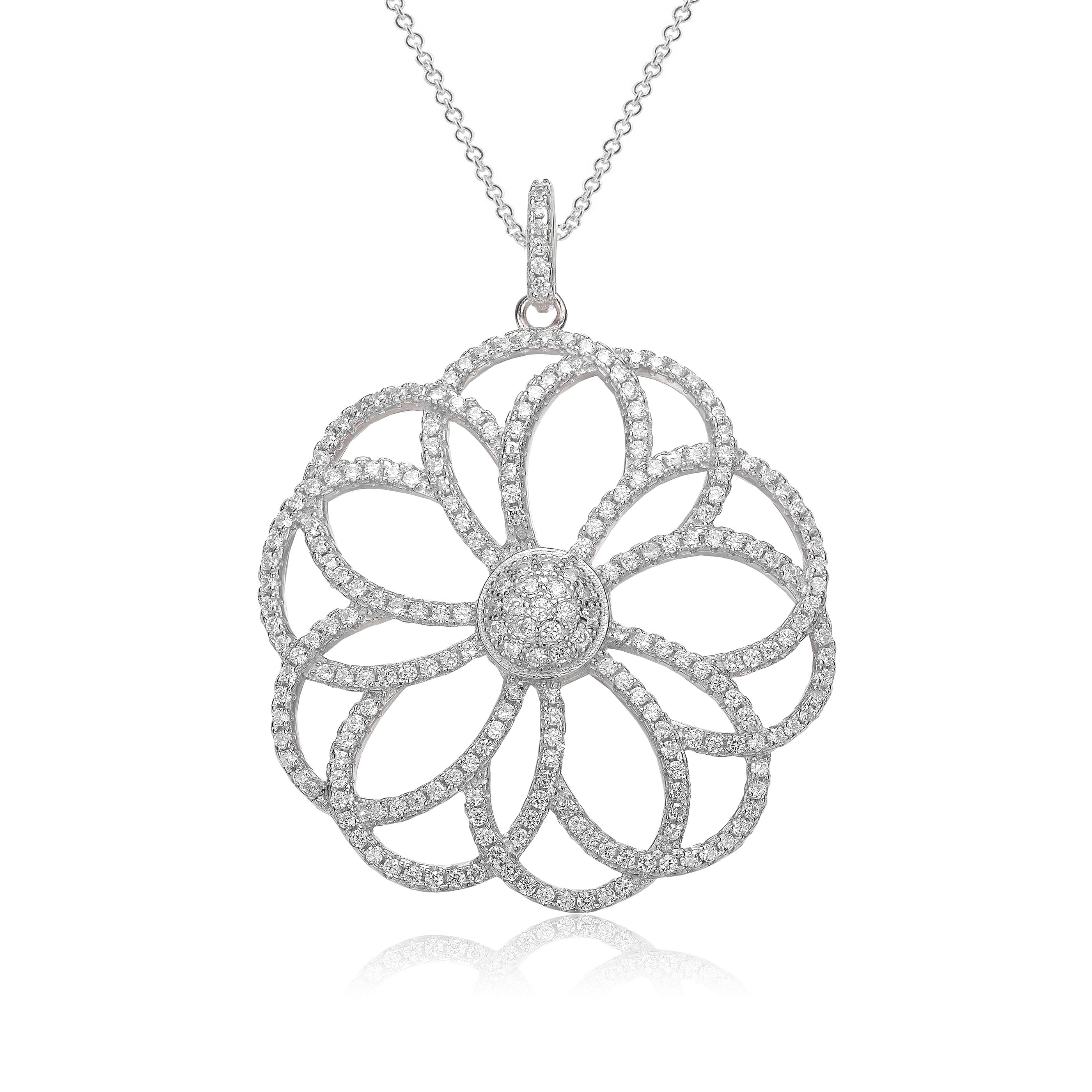 This is a beautiful Sterling Silver with a Rhodium plated piece that has very detailed silver base and Cubic Zirconias for a unique design. This flower-shaped with a circular disc pendant features Sterling Silver with Rhodium plated base fully paved with clear round Cubic Zirconias. An elegant piece of jewelry for stylish outfits. This is secured using a spring ring clasp. Available in different options.