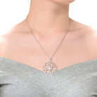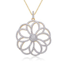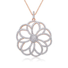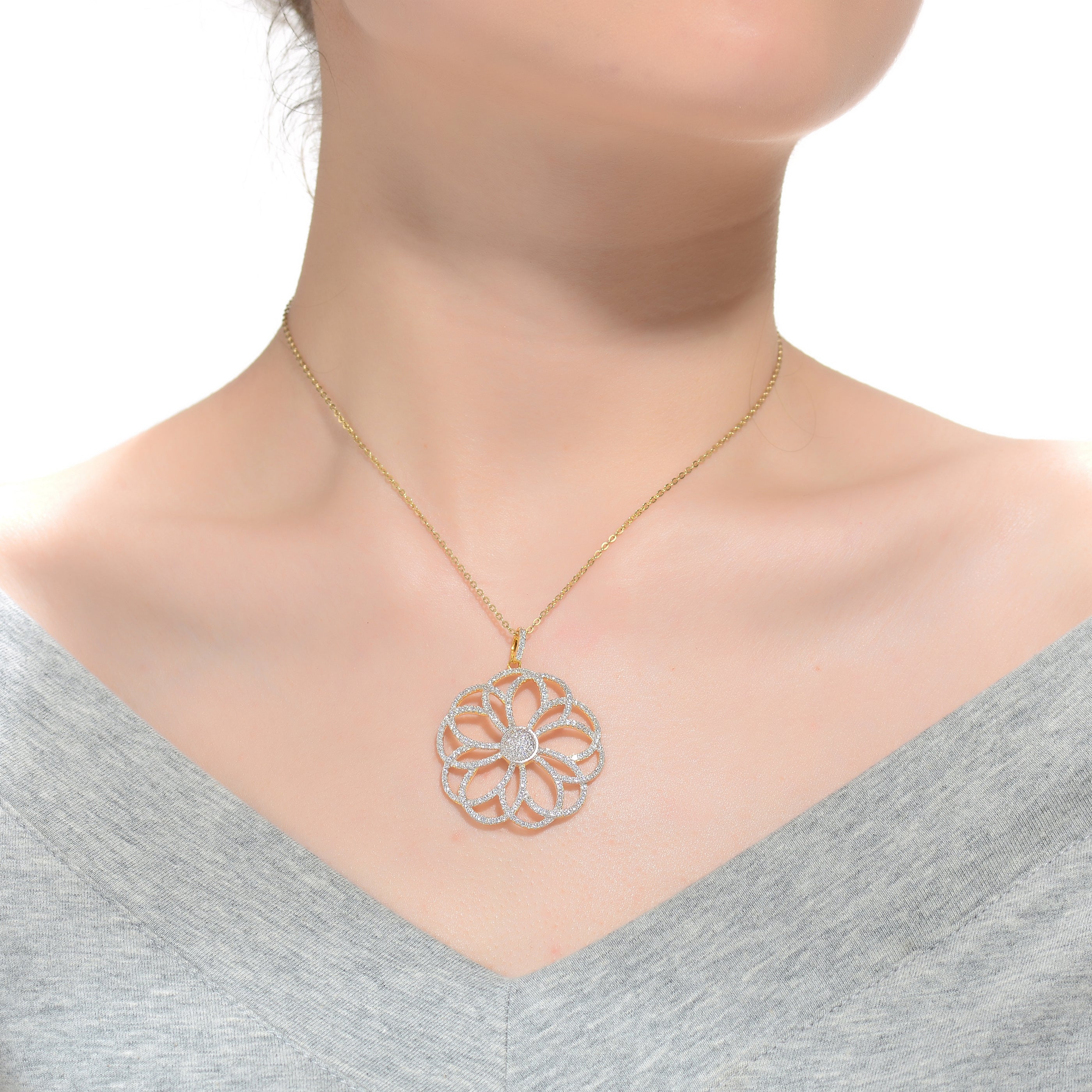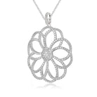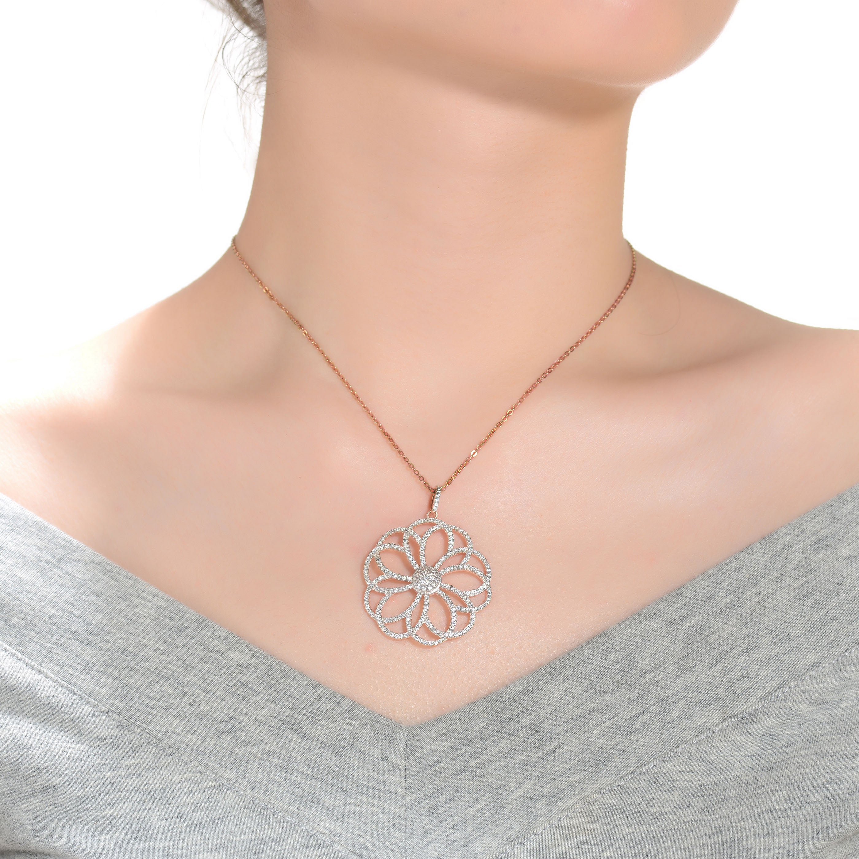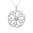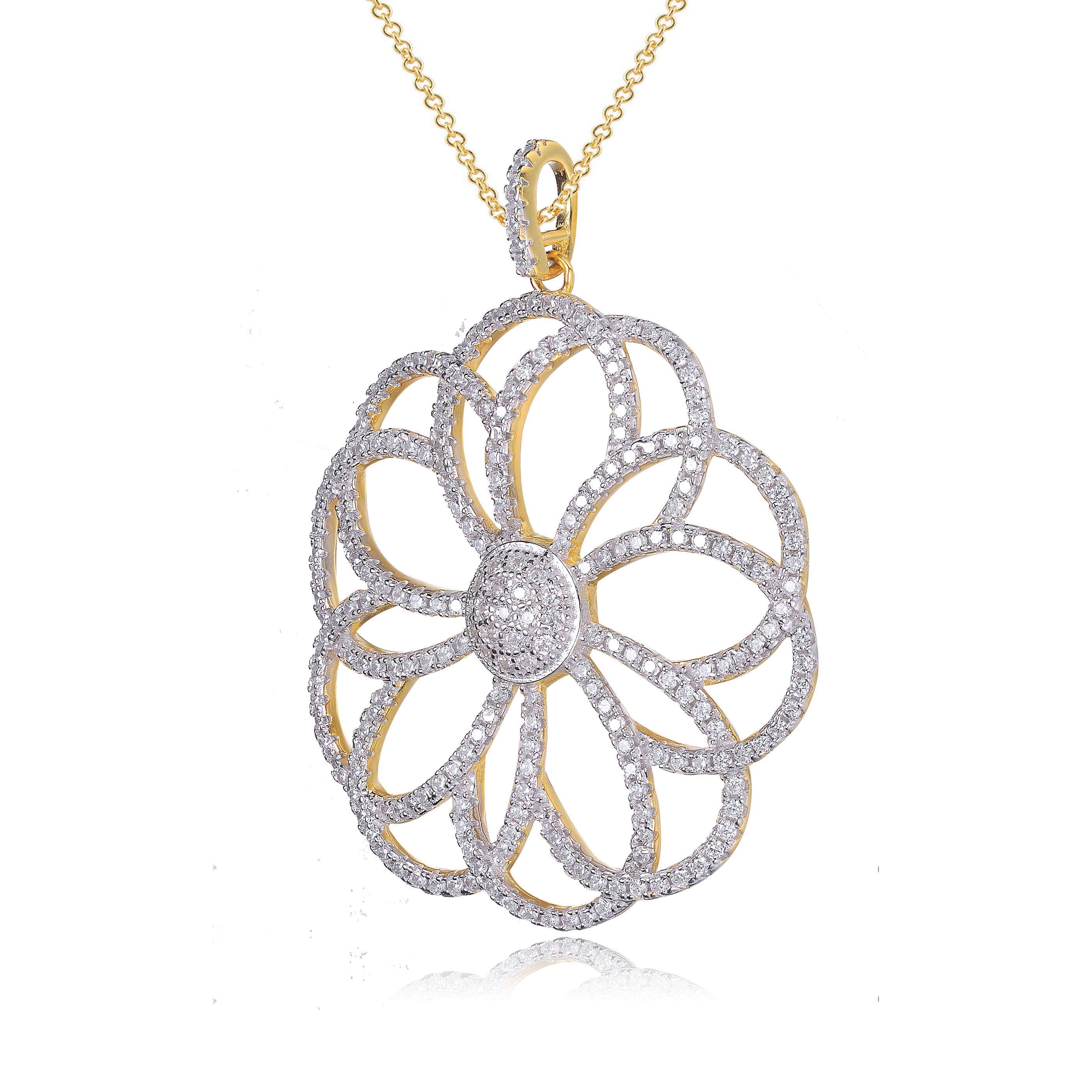This is a beautiful Sterling Silver with a Rhodium plated piece that has very detailed silver base and Cubic Zirconias for a unique design. This flower-shaped with a circular disc pendant features Sterling Silver with Rhodium plated base fully paved with clear round Cubic Zirconias. An elegant piece of jewelry for stylish outfits. This is secured using a spring ring clasp. Available in different options.