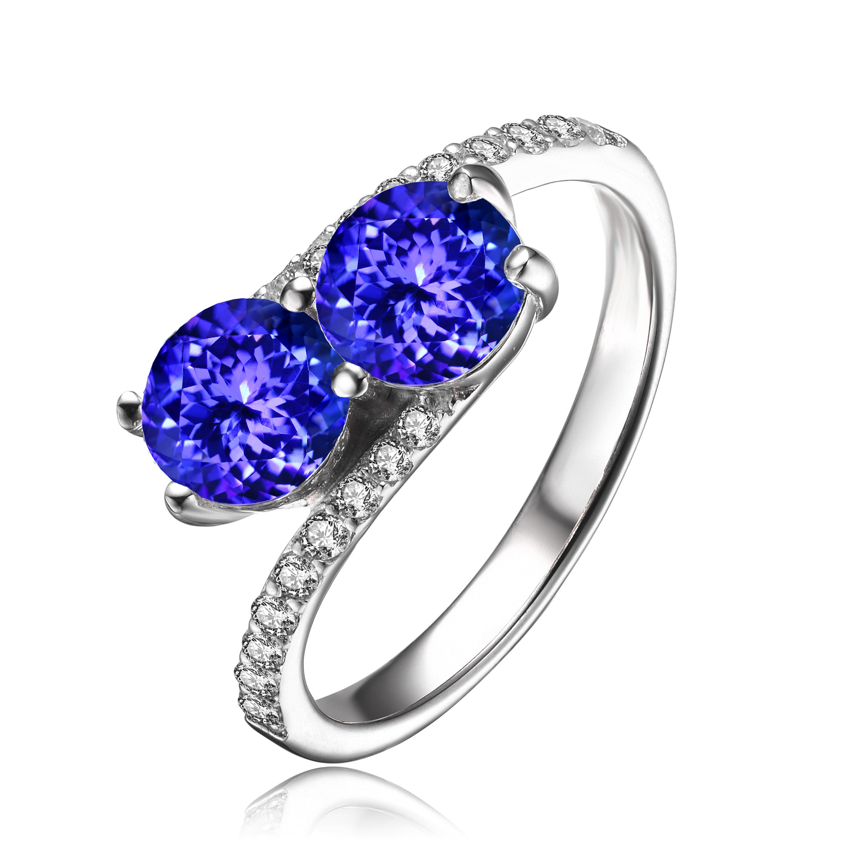 This classic spoon type ring features two dazzling Tanzanite blue round Cubic Zirconias twisted together with smaller clear round Cubic Zirconias partially paved in the band. This ring is set in highly polished Sterling silver with Rhodium plated. The ring will deifinitely complements your look.