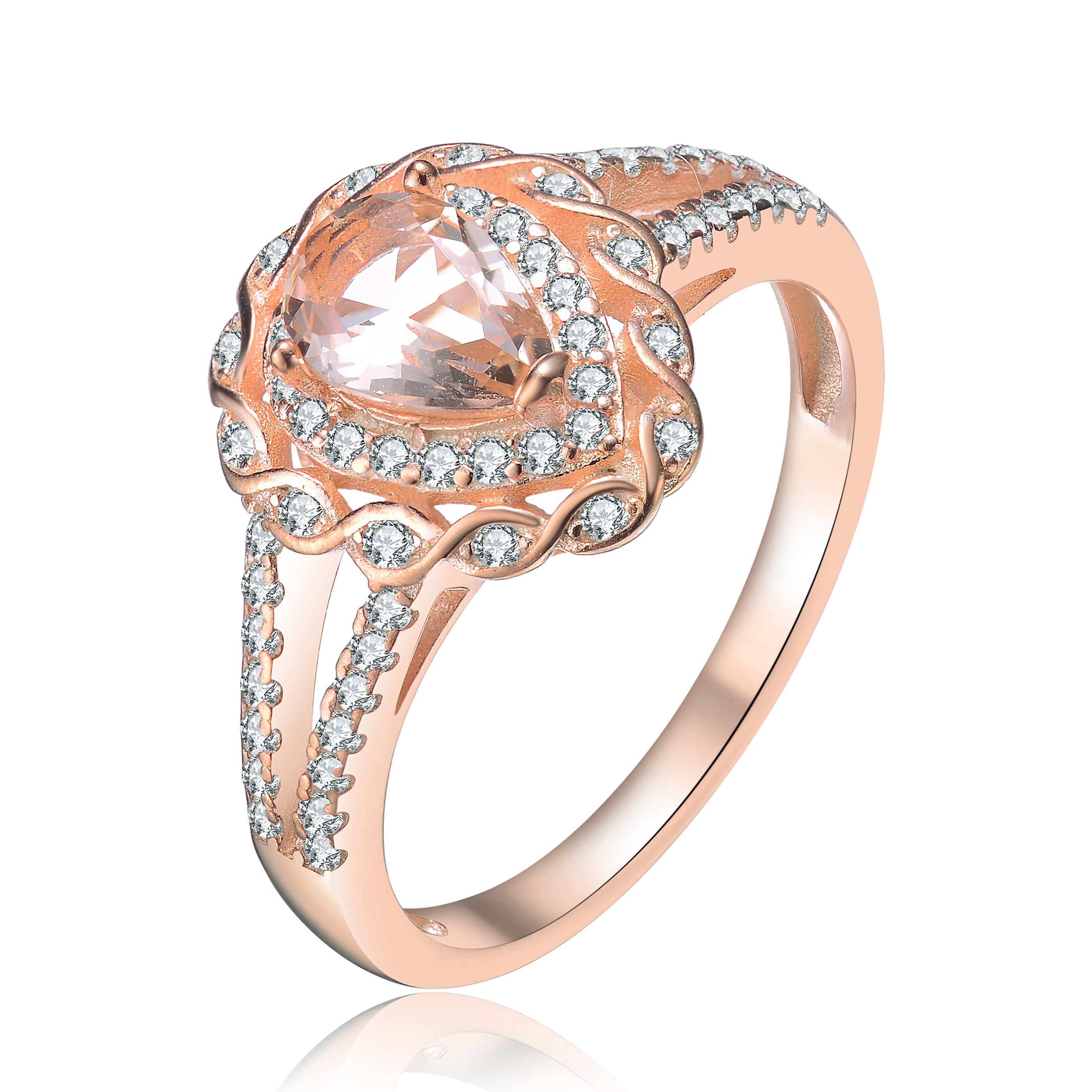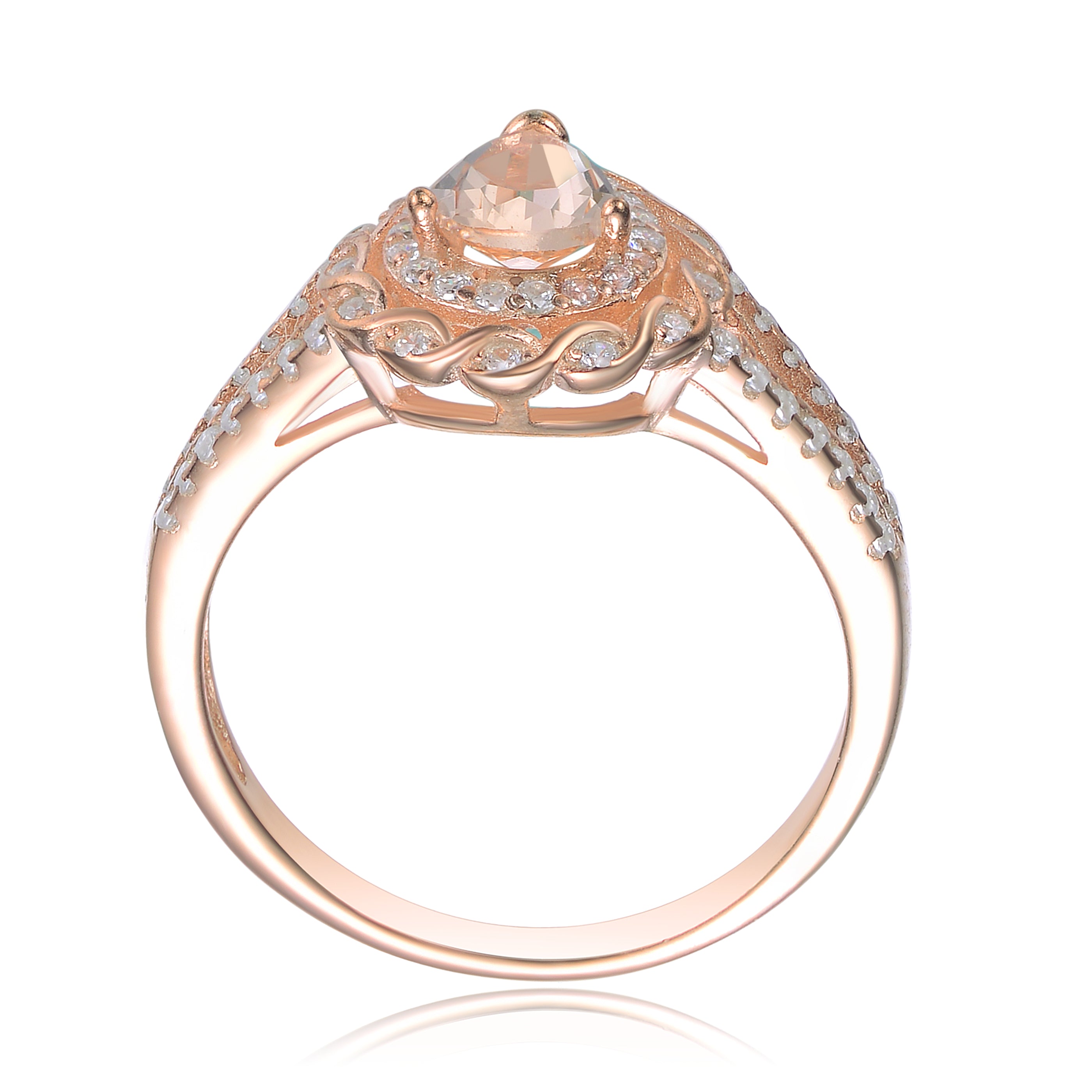 This modern style solitaire with accent ring features a gorgeous Morganite pear Cubic Zirconia solitaire with a double halo of small clear round Cubic Zirconia. The outer halo is inspired in an infinity style making this ring unique and contemporary. This ring also has a split band studded with small clear round Cubic Zirconia that adds style and sparkle to this ring. It is set in Sterling silver with Rose Gold plated so it's guaranteed to be hypoallergenic.