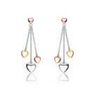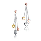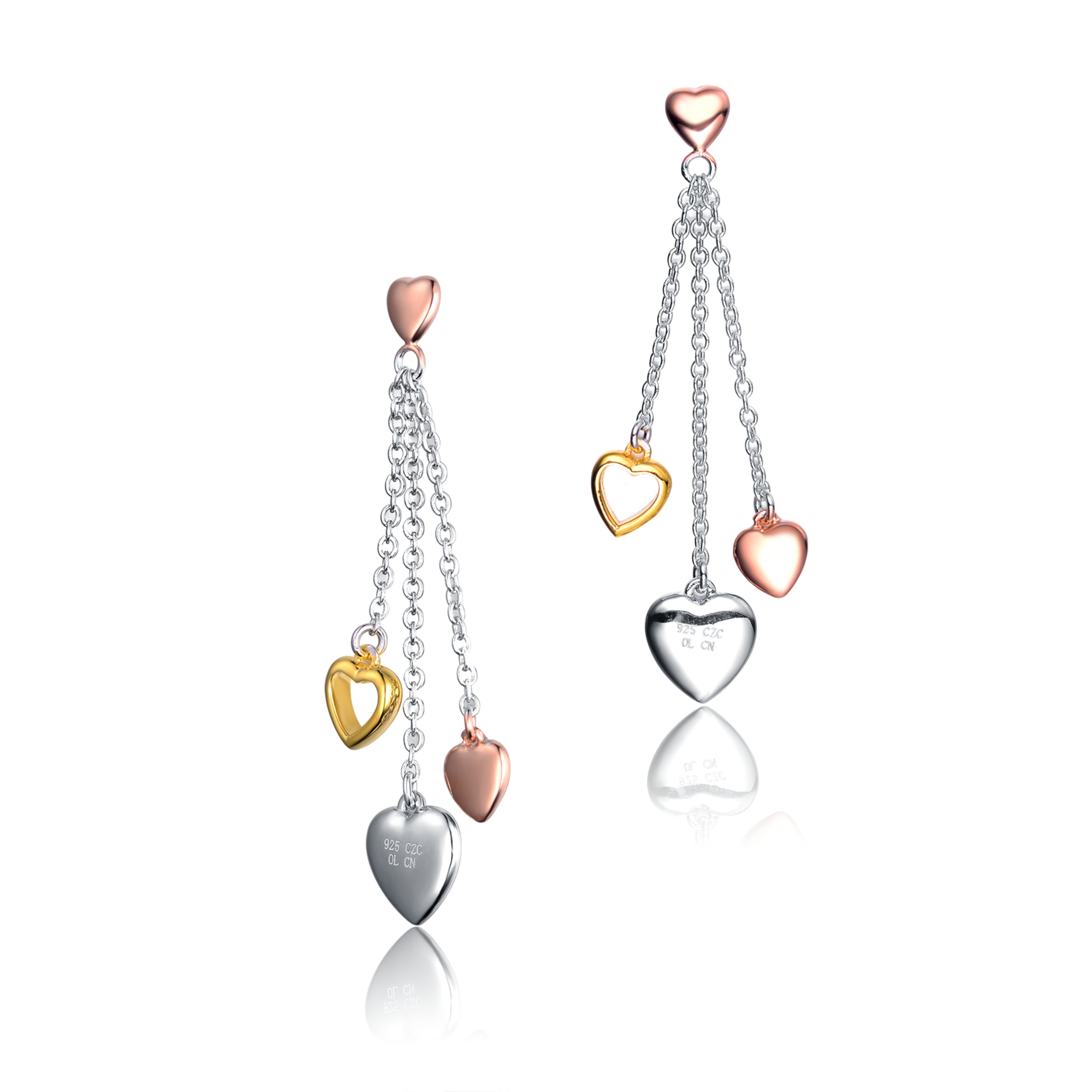 These stunning tri-color heart dangling earrings are crafted from high-quality sterling silver and feature a unique design with three vertically linked hearts. Each heart is plated in a different metal finish: the top heart in rose gold, the middle heart in gold, and the bottom heart in rhodium, creating a beautiful gradient effect. The combination of rhodium, gold, and rose gold plating adds a touch of elegance and versatility, making these earrings perfect for any occasion.