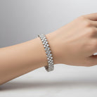 Very stylish Rhodium Plated Three Row Bracelet. The Three Row Bracelet features clear round brilliant Simulated S in four prong settings. Crafted of Rhodium Plated and it is secured with box clasp. Bracelet Width: 7.5mm. Exquisite piece of jewelry.