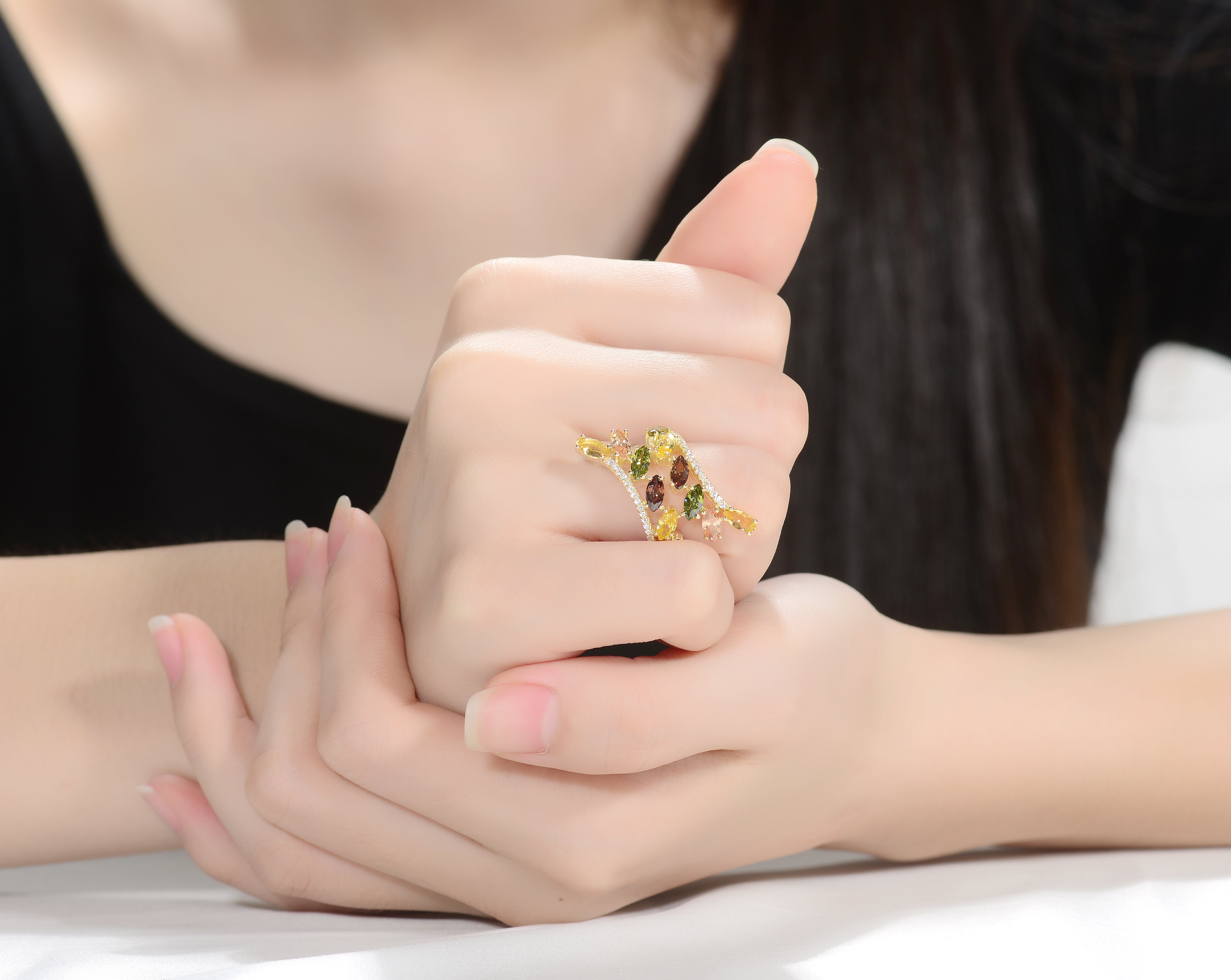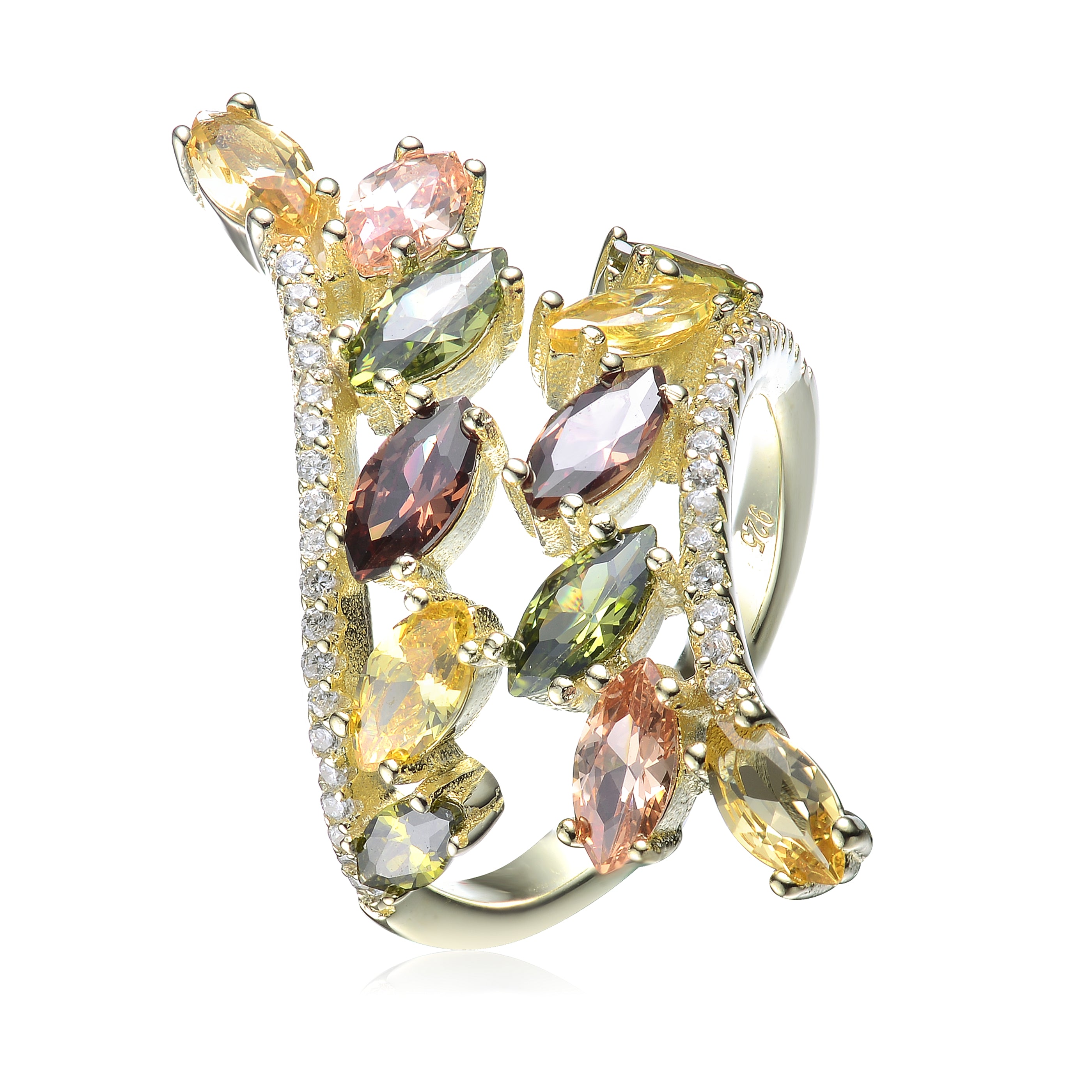 Classic swirl design features pronged multi colored cubic zirconia and paved small clear gemstones in the layers. This swirl ring is made from .925 sterling silver plated with yellow gold that compliments it style.